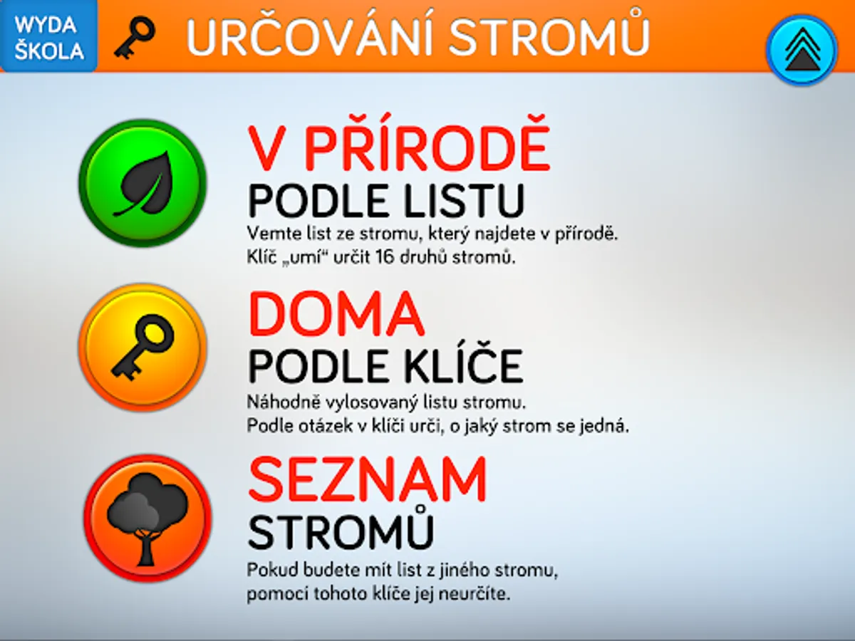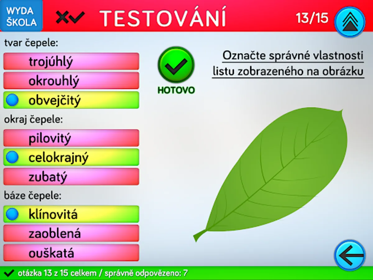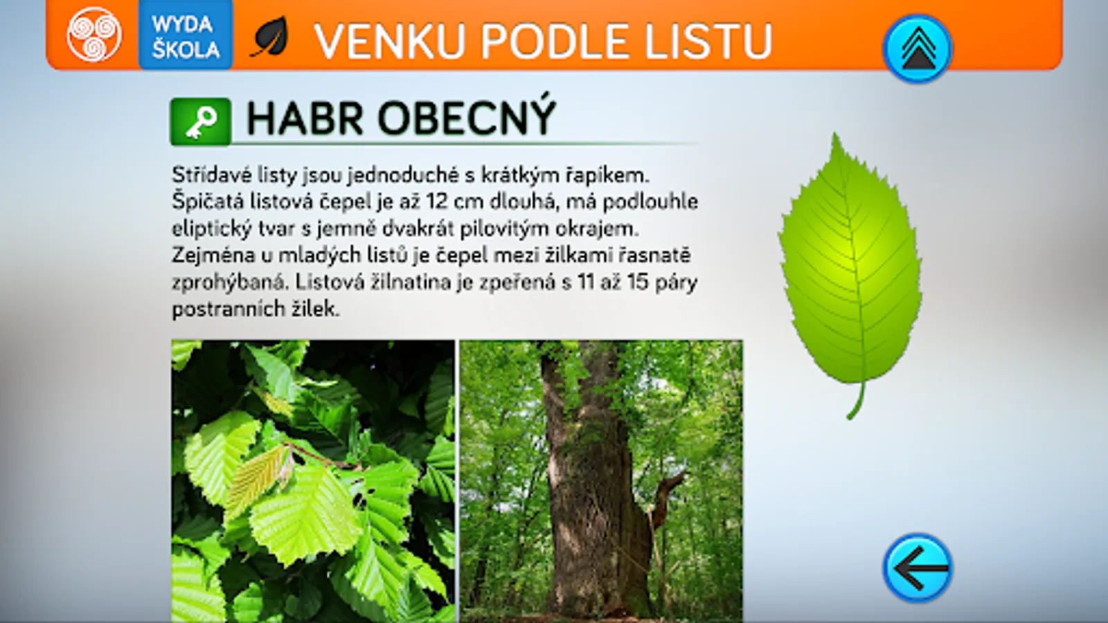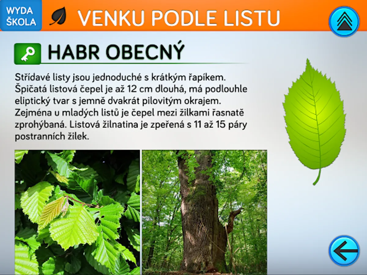 The application consists of four parts. The first will teach you a thorough knowledge of the issue through eleven topics devoted to parts of the paper. The second part is used to practice the knowledge of terminology from the first part. The third part of the application is designed to test knowledge and is divided into two levels. For primary school pupils, a level for beginners is appropriate, which includes three basic types of test questions. Second grade students can take advantage of advanced testing, where there are logical types of questions such as conflicting statements and multiple answers. For competitive users, testing in pairs is prepared in the application. The last fourth part is an interactive key for identifying trees by leaf shape. The key allows you to identify 16 trees normally growing in our territory in the mode of field walks in nature, or by determining according to a randomly selected leaf in the classroom.