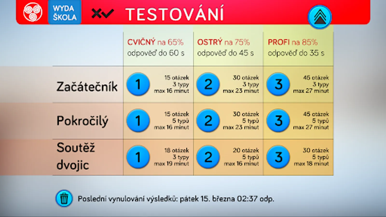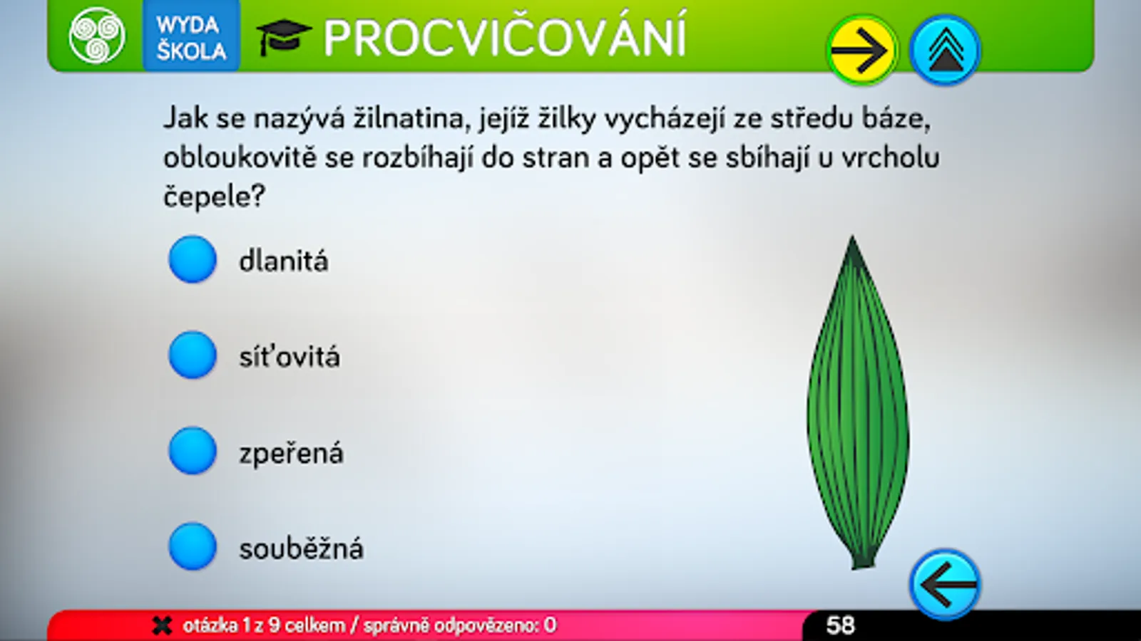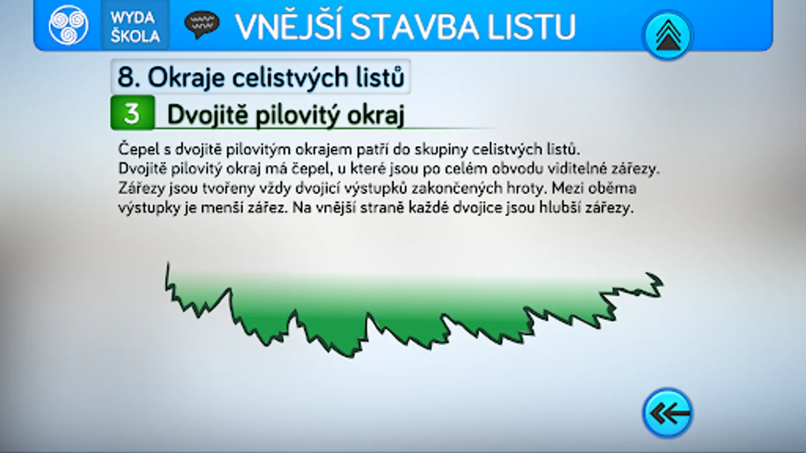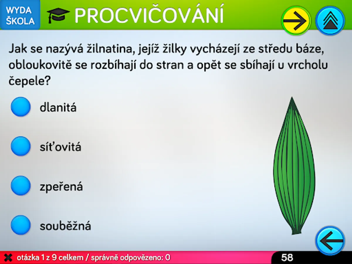 The application consists of four parts. The first will teach you a thorough knowledge of the issue through eleven topics devoted to parts of the paper. The second part is used to practice the knowledge of terminology from the first part. The third part of the application is designed to test knowledge and is divided into two levels. For primary school pupils, a level for beginners is appropriate, which includes three basic types of test questions. Second grade students can take advantage of advanced testing, where there are logical types of questions such as conflicting statements and multiple answers. For competitive users, testing in pairs is prepared in the application. The last fourth part is an interactive key for identifying trees by leaf shape. The key allows you to identify 16 trees normally growing in our territory in the mode of field walks in nature, or by determining according to a randomly selected leaf in the classroom.