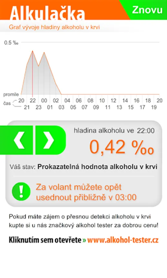 Alkulačka (Breathalyser). Alcohol calculator for approximate calculation of per mille in blood and time for its elimination. Simply enter values to calculate blood alcohol, alcohol calculator then calculates and displays a graph of blood alcohol level and the time you get behind the wheel again.