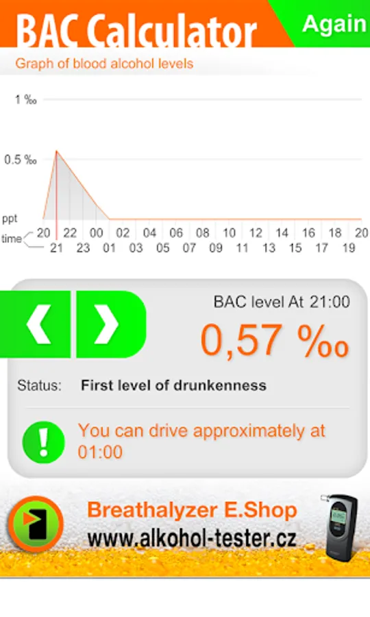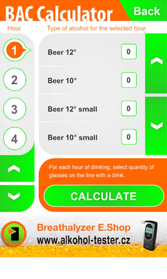Simply enter values, choose your drinks & hours to calculate alcohol in blood alcohol calculator then calculates and displays the graph of the development of blood alcohol levels and time again when you get behind the wheel.