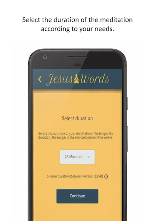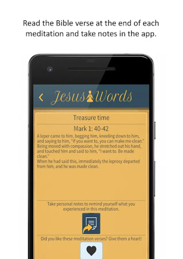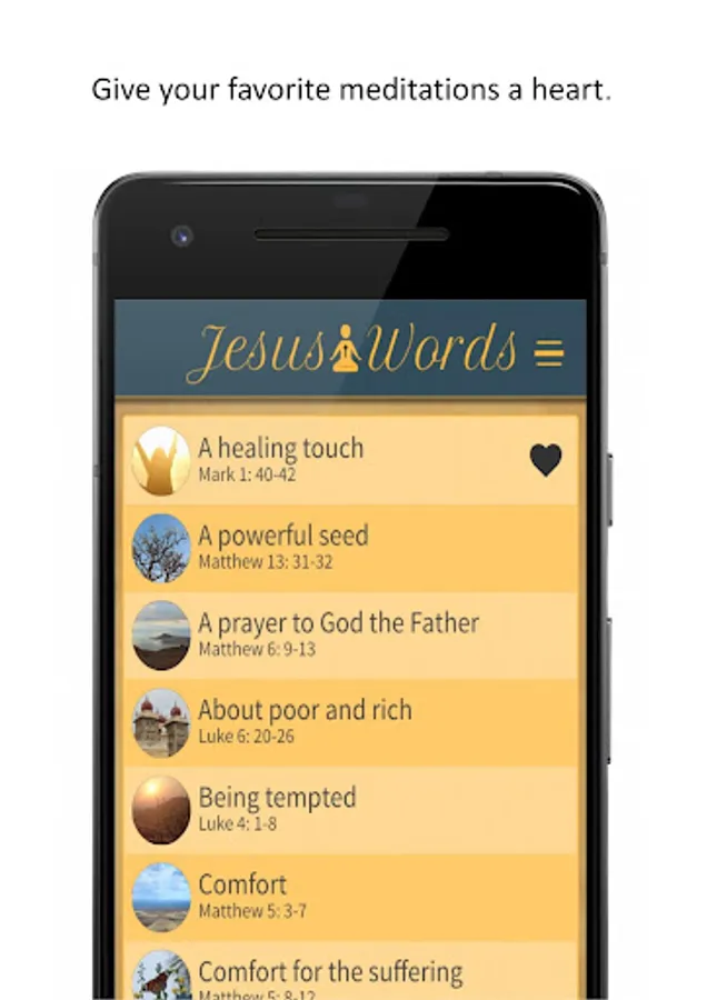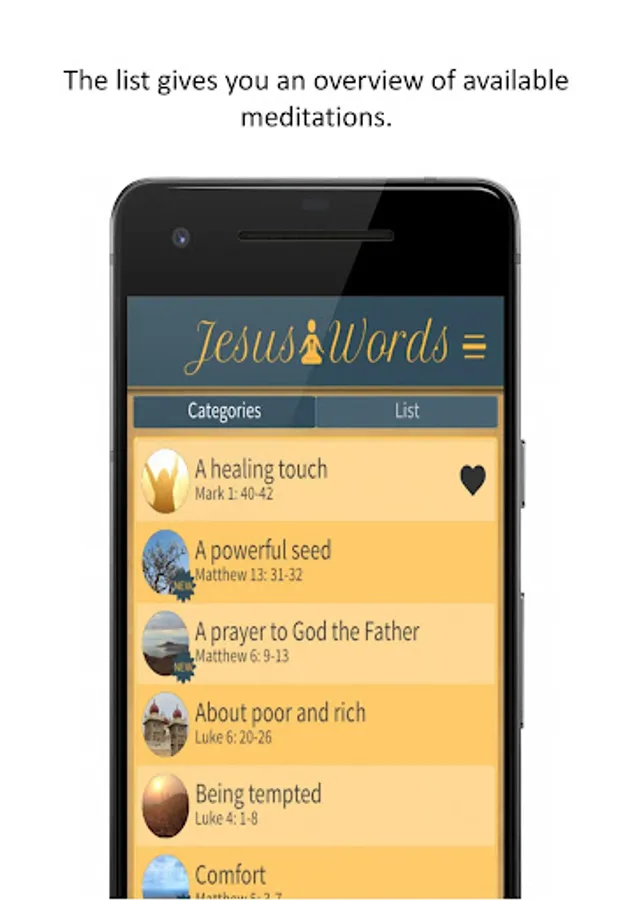 The Jesus Words Meditation app contains guided audio-meditations. The meditations consist of three parts: First you are guided into silence through breathing and body awareness. Find a place of inner silence and prepare yourself to listen. Words of Jesus are in the center of each meditation. The silence between the sentences allow you to ponder over the words. Listen with your heart. Find peace and guidance. At the end of each meditation there is time to reflect on your personal experience.