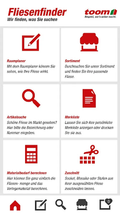 With just a few clicks you can browse the entire Toom Baumarkt tile assortment. Use the tile finder to find your personal tile or ceramic base plate for your home.