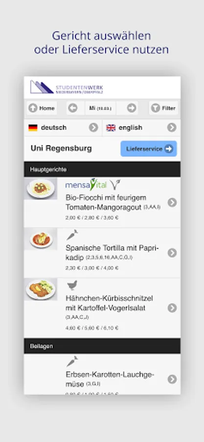 You can filter our dishes according to your preferences: vegan, vegetarian, chicken, pork, beef, just as you like. A list of allergens and additives is also displayed.