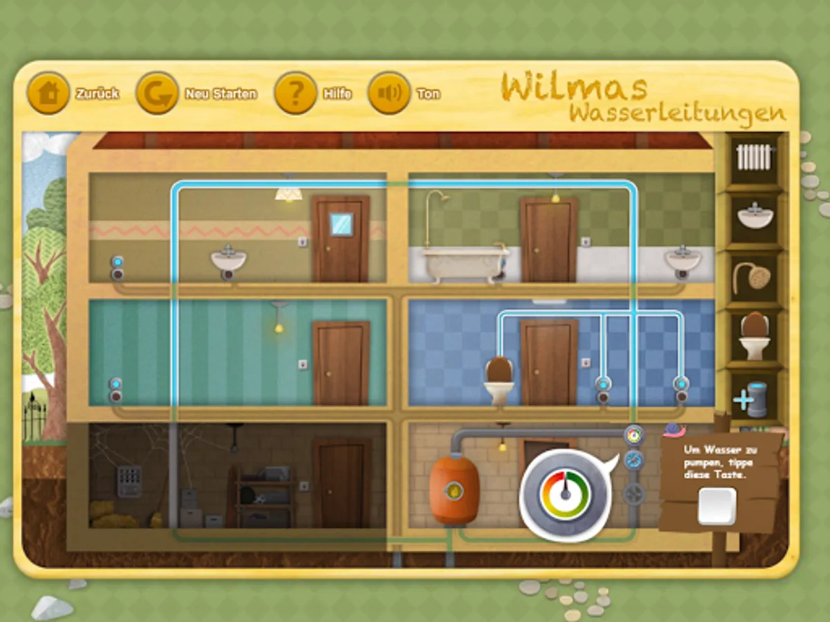 Using the mouse, you can discover and repair the water pipes error. In Level 5 you have even the possibility to equip the house your own style with sink, tub, toilet, heating, and to lay a water pipe for. You can what you have built test.