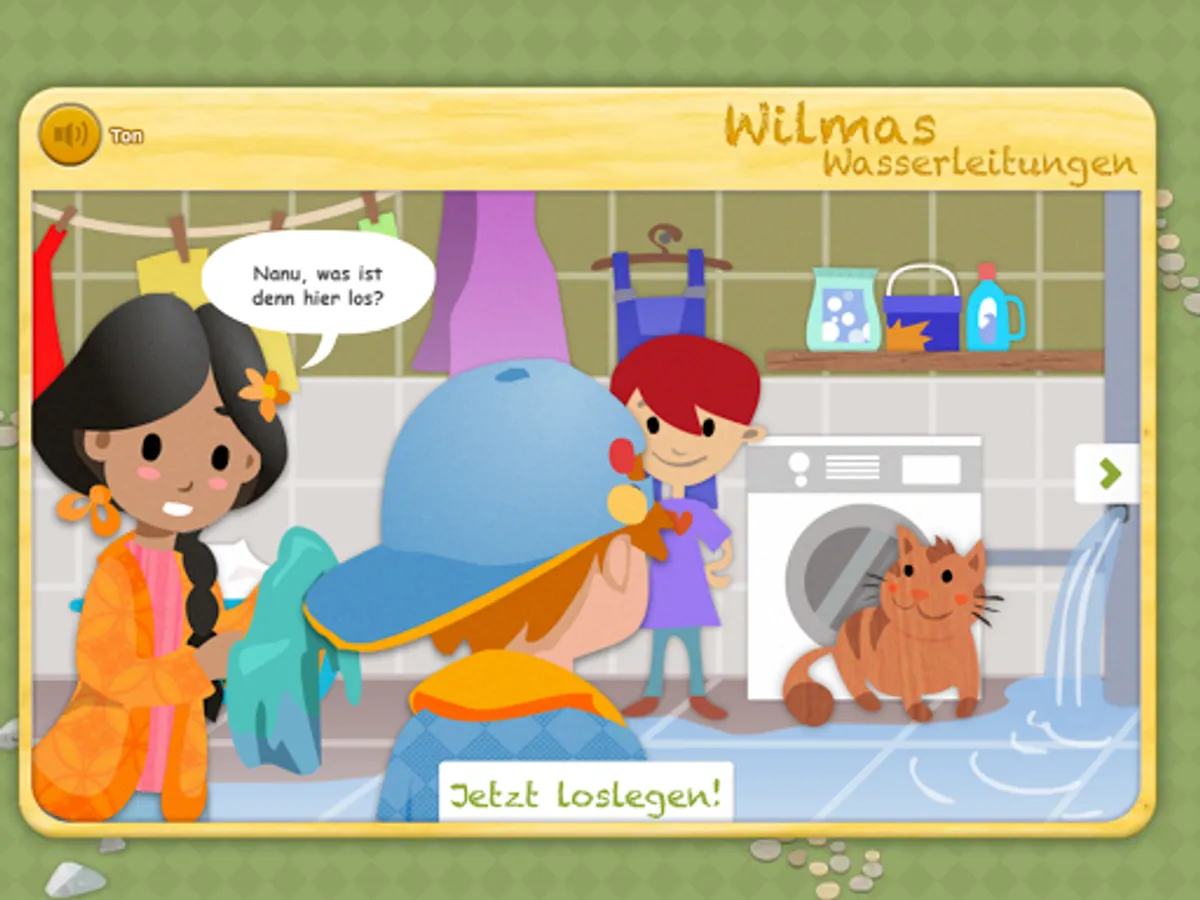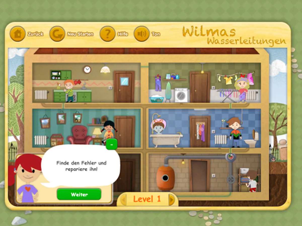 In the laundry room, a water pipe is broken. July Tim and Wilma go to the basement to shut off the main valve. Once that is done, they set off on the search for the broken water pipe. They are helped Wilma special magnifying glass, with which one can see into walls and other objects.