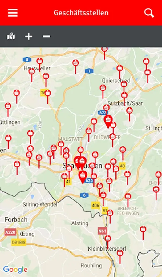 The practical map feature displays all benefit partners and branches of the Sparkasse Saarbrücken. The app locates your location (if you allow positioning) and calculates the route to the desired destination.