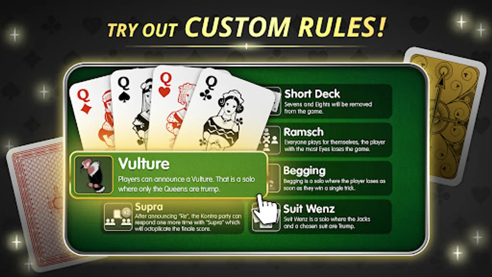 - Use original Sheepshead playing cards or house cards with optimized legibility.