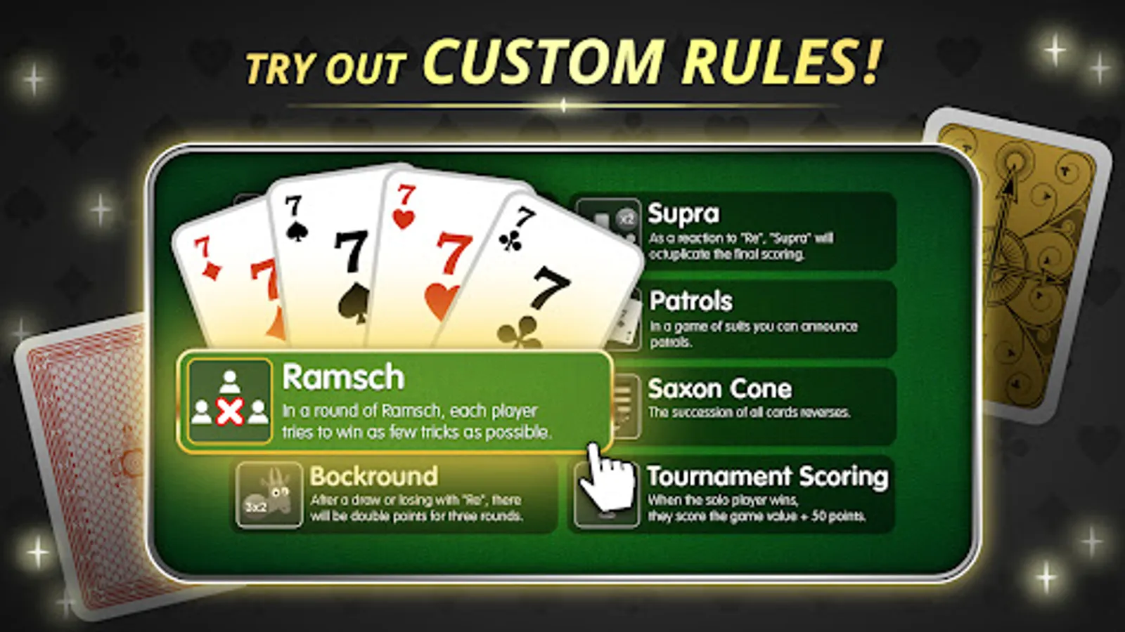 - Discover various special rules: Ramsch, Patrols, Tournament Scoring, and many more.