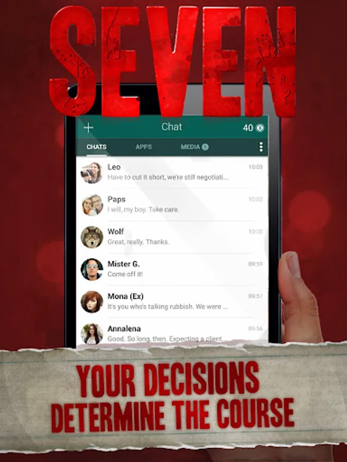 In Seven you can directly decide how to interact with the people in your life. Every text message and every time you decide influences the relationship you have with all the characters. The interactive thriller games will force you to choose between people and let some of them get lost in the scary depths of this horror story.