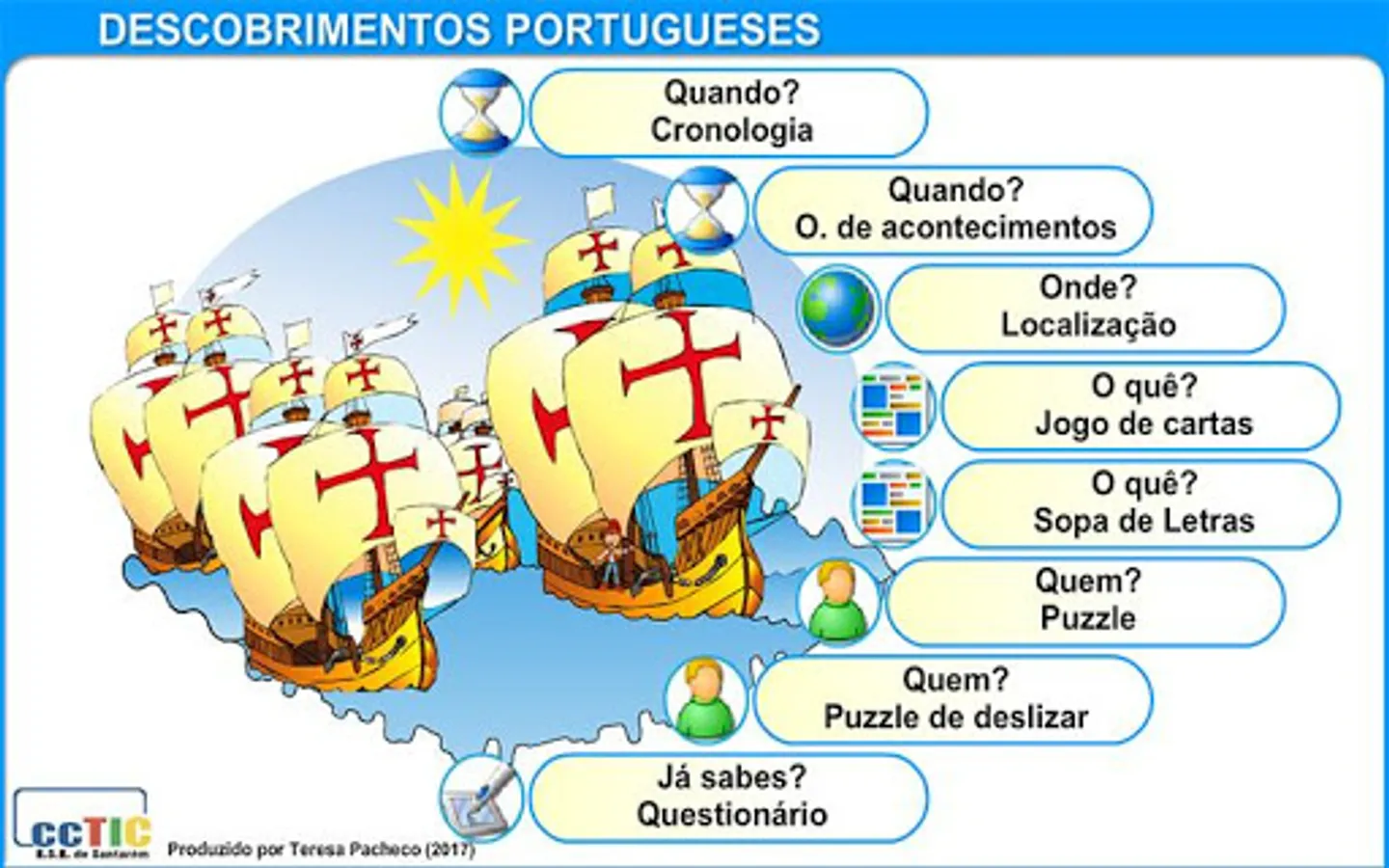 It includes 22 activities on the theme of the Portuguese Discoveries: spelling games, quizzes, puzzles, sorting events and activities location on maps.