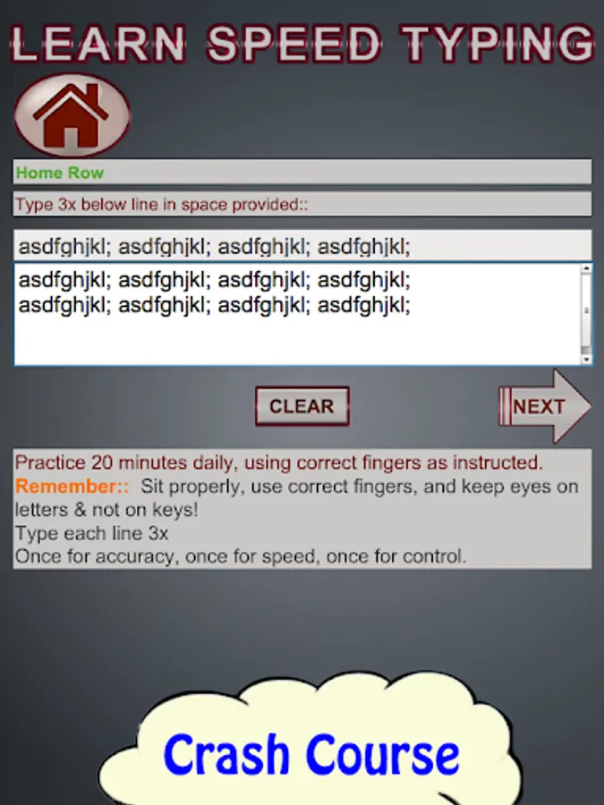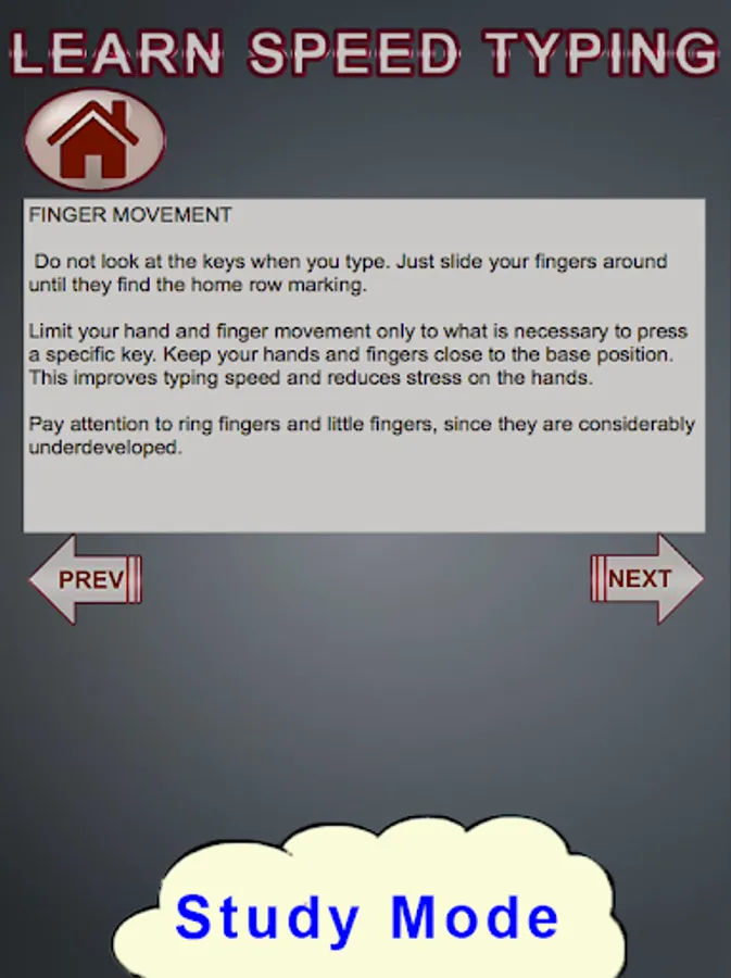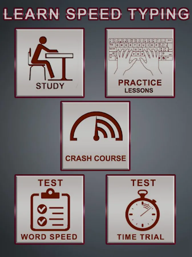 Learners can choose between learning how to type, practice your touch typing skills, crash course for quick learning or taking a test to test their typing speed. In all cases, instruction is provided in a fun, visual format utilizing an intuitive touch interface.