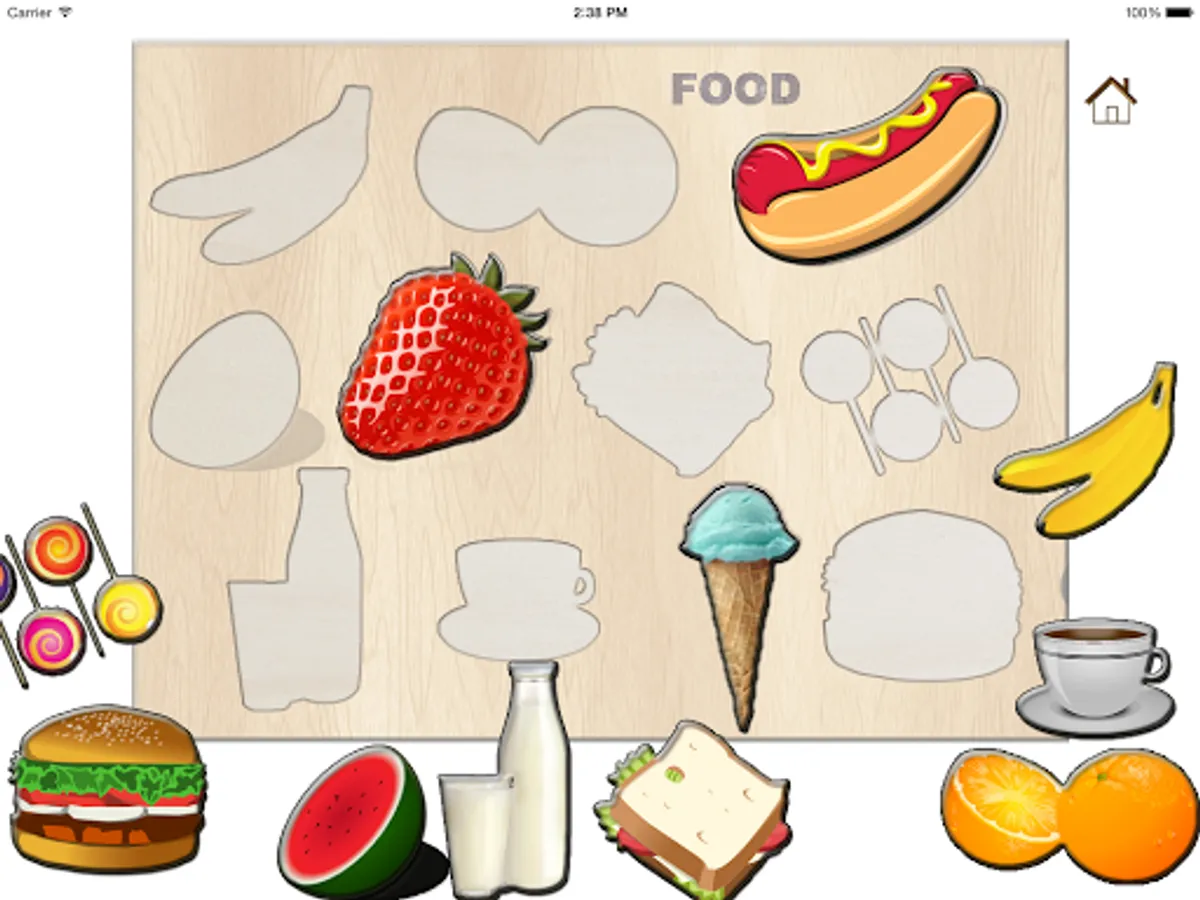 Children's favorite foods are elevated to an art form in this colorful wooden puzzle. The idea is for toddlers to learn names of food:: Once children identify the correct puzzle piece, they must use their eye-hand coordination to maneuver the shape into the slot. As the piece is snapped in, children learn name of food from sound.