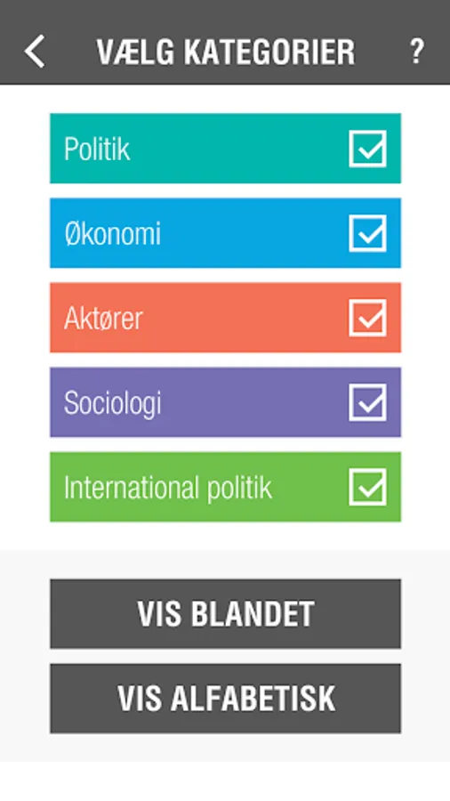 The app contains five sets of cards with the concepts and actors. There are 60 cards in each set. The sets are: