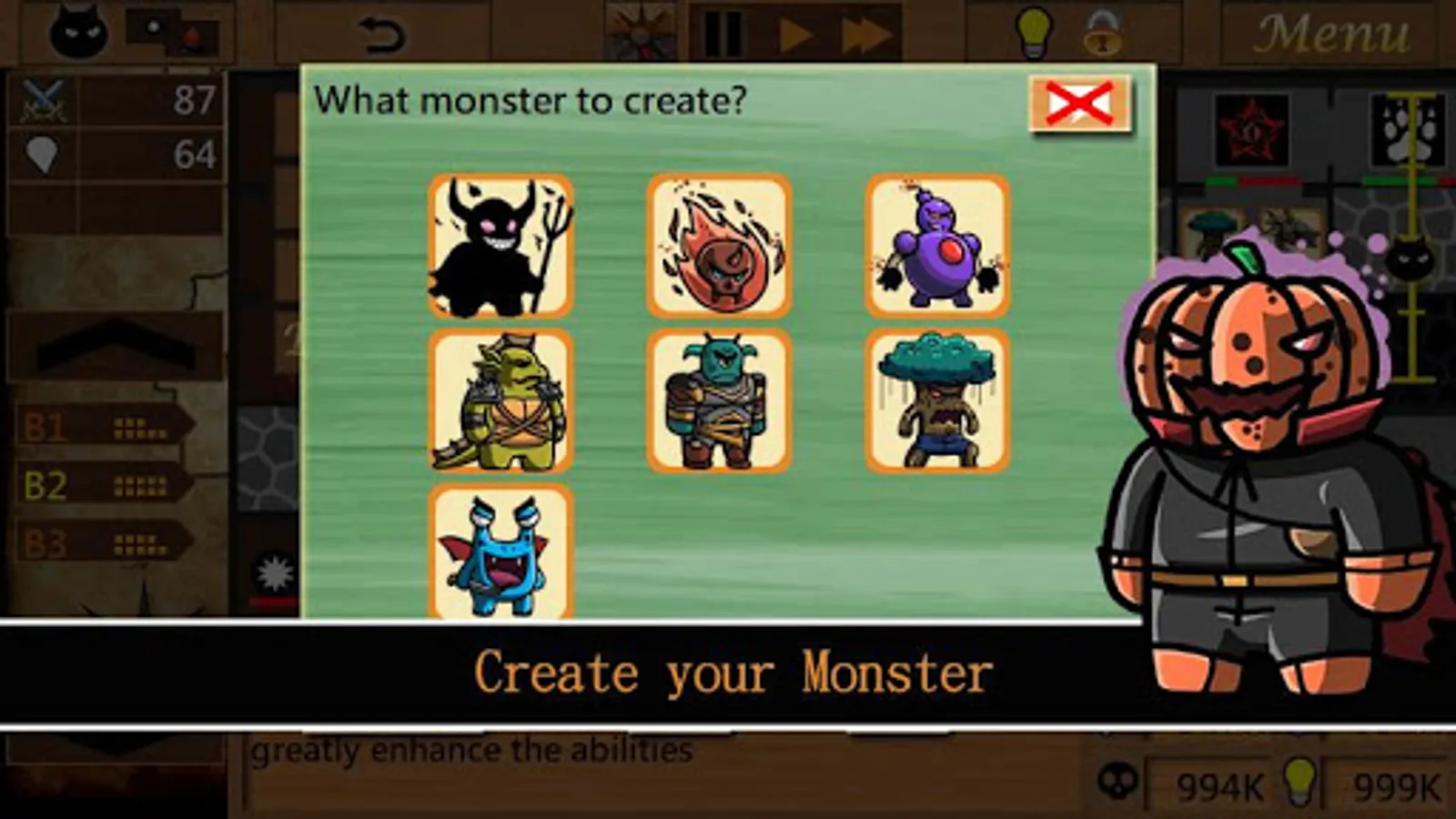 You can create different monster which has different talent, these monsters will be the most powerful regiment to defeat the adventurers.The monsters can be synthesized,they will become a more powerful monster.