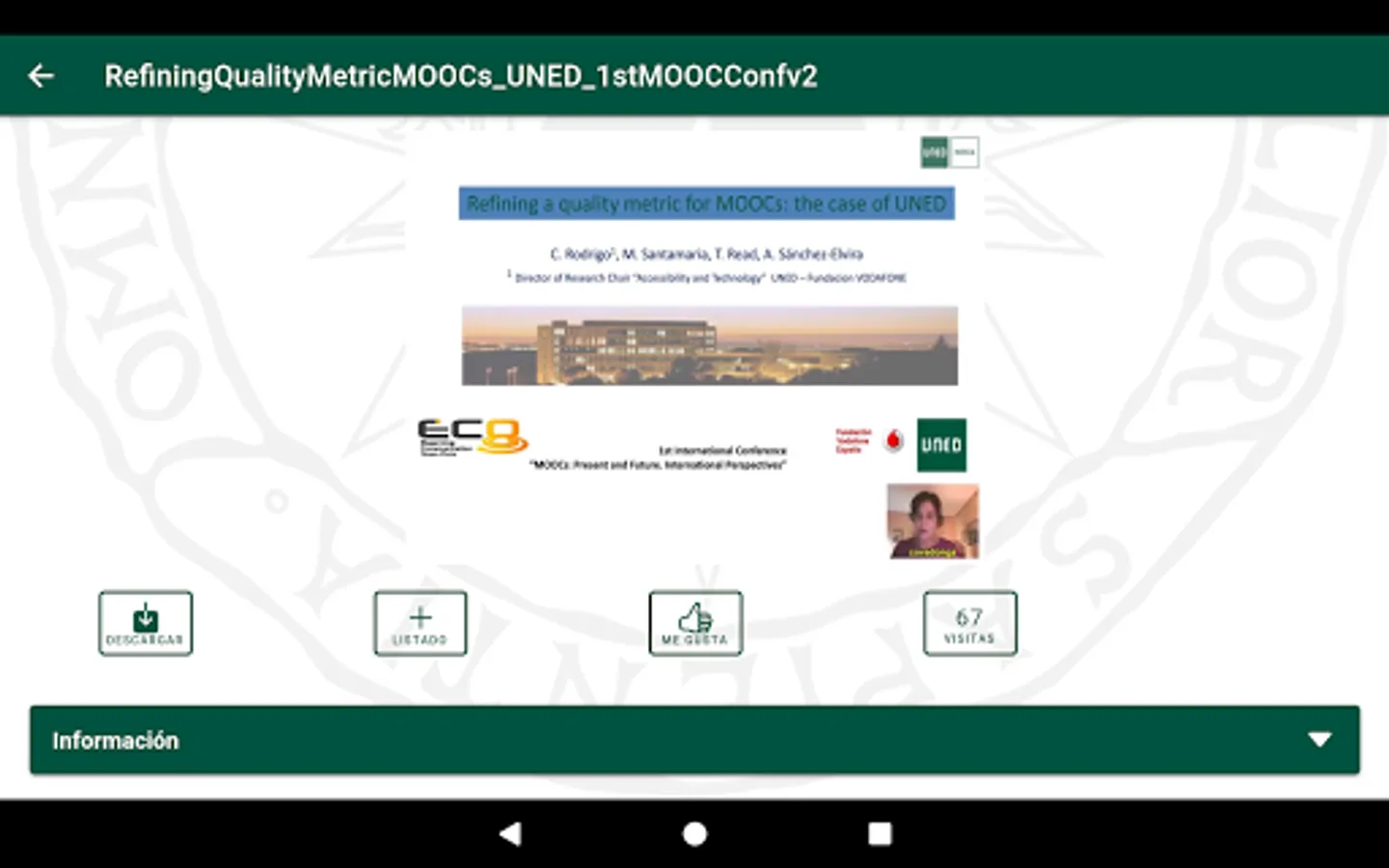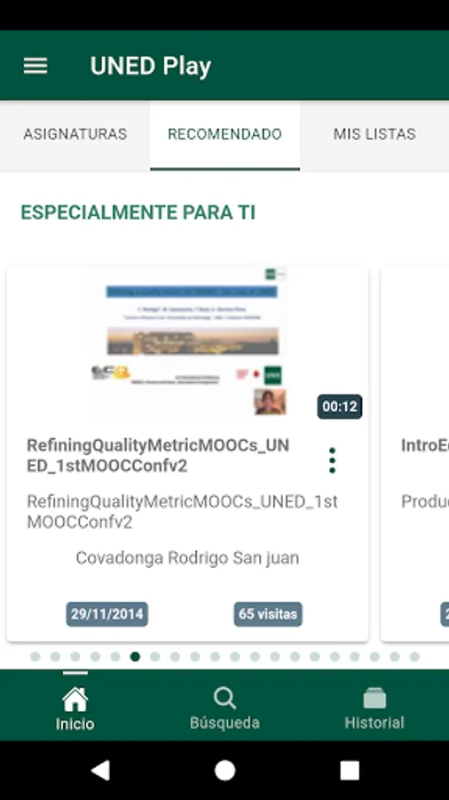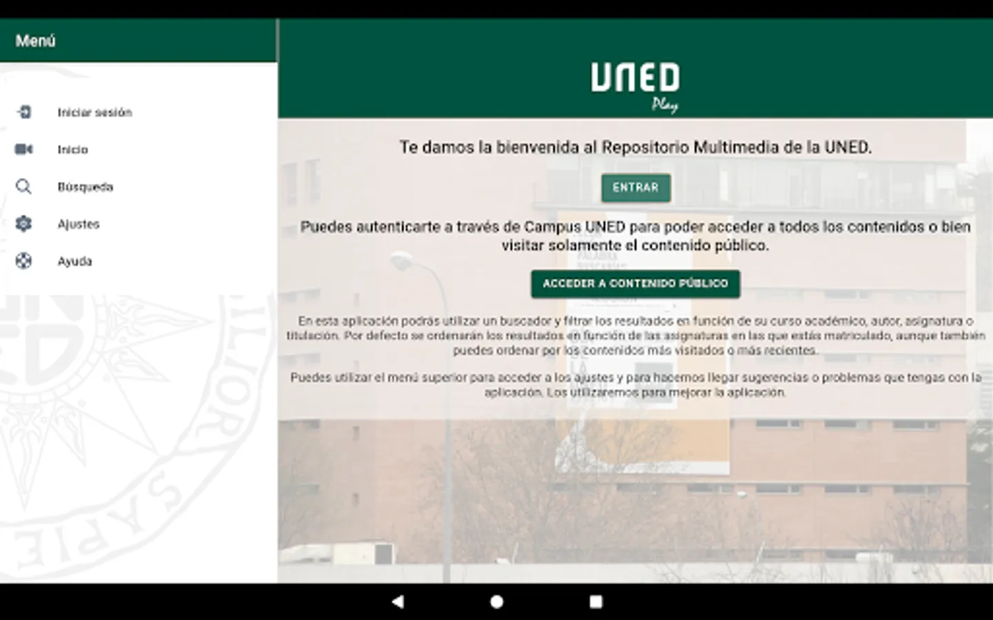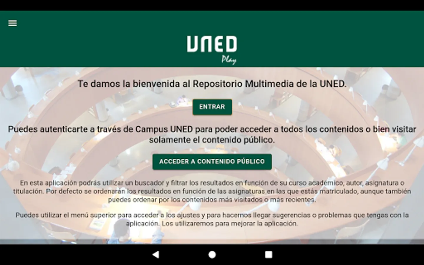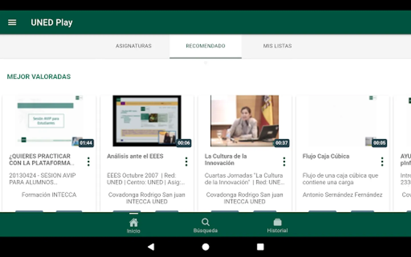 Official application of the National University of Distance Education (UNED) for the reproduction of multimedia resources from the repositories. These audiovisual resources are the sessions published on the INTECCA AVIP Portal and the videos on Canal UNED, which include events, video classes, tutorials from Associated Centers, documentaries, etc., which are held daily at UNED. This new search engine allows you to find the resources belonging to the subjects in which you are enrolled and also facilitates the filtering of results based on authors, degrees and courses, among others.
