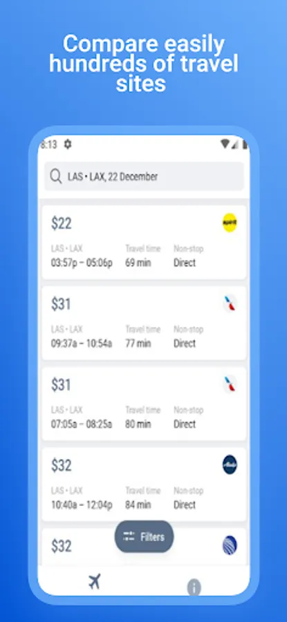 The airline ticket app compares flight offers from hundreds of airlines and travel agents and sends great deals on airline tickets straight to your smartphone, tablet or other mobile device. Flight booking made easy.