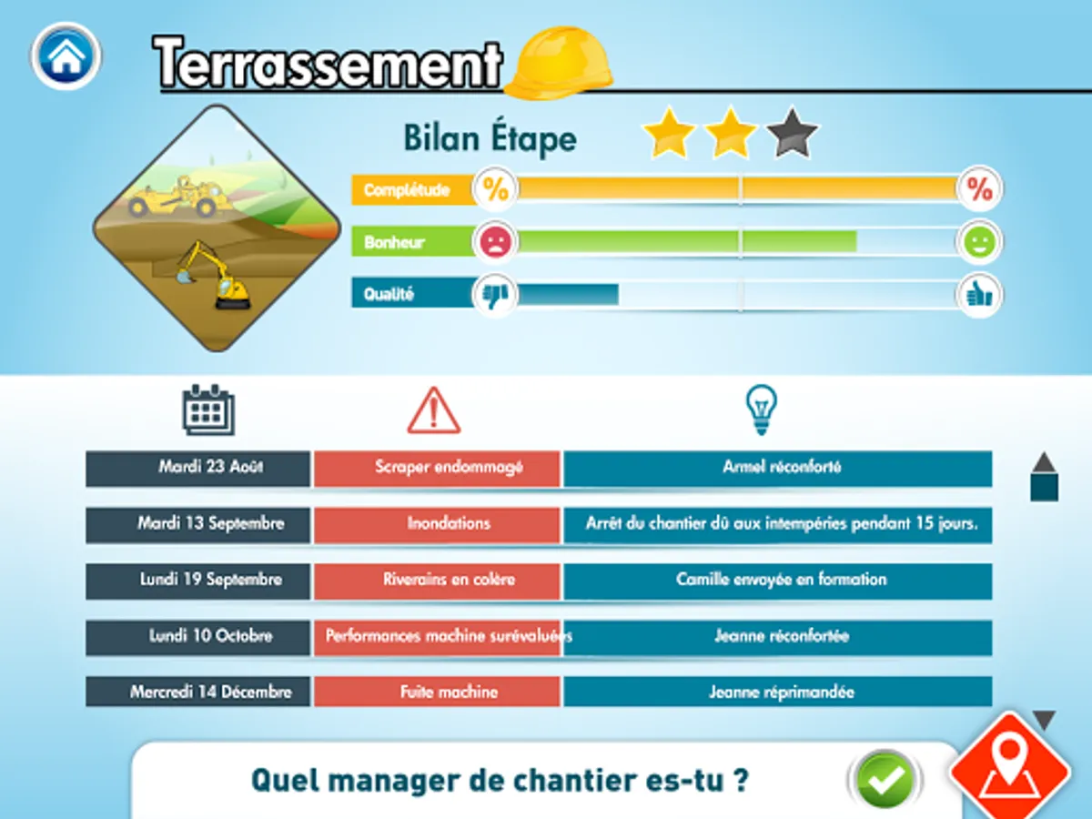 This is to recruit the team, manage the site and resolve the various incidents that may occur at any time. The player must respond quickly, sensitively and effectively ensuring respect the imposed schedule.