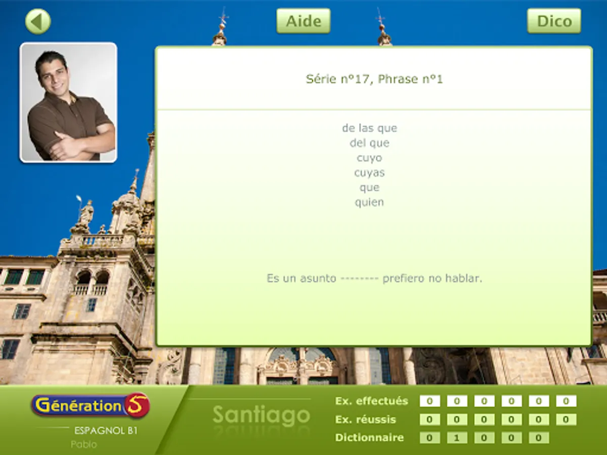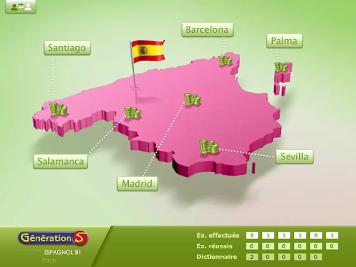 It offers a "trip" to different cities in Spain: Palma de Mallorca, Seville, Santiago de Compostela, Barcelona, Salamanca and Madrid. Each stage corresponds to a type of activity and will be the opportunity to approach many cultural themes: daily life and living environment, cultural and historical heritage, landmarks and geographic realities, literary and artistic heritage.