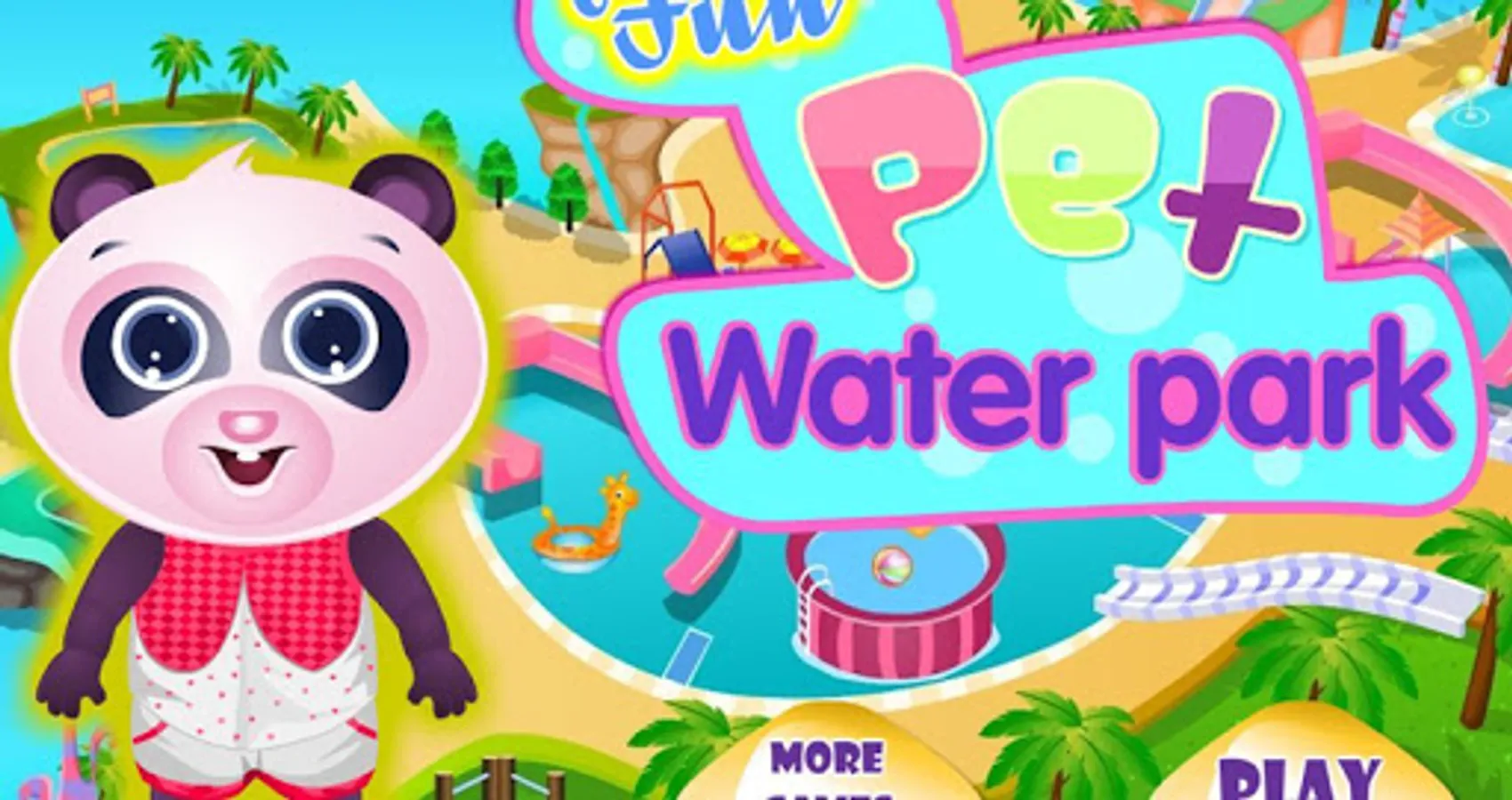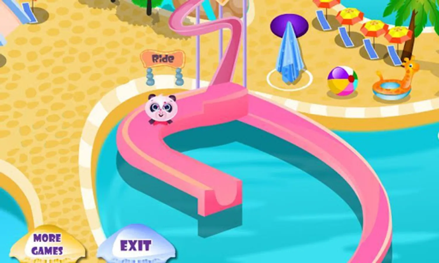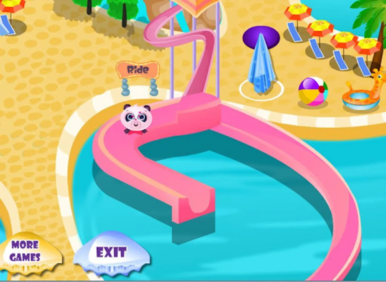 This super cute panda is going to a waterpark for pets! You can join him on his trip and have a lot of fun in Aqua World! This waterpark game has a lot of different minigames to play. The panda wants to play in the water, the first thing is the water slide! Slide and play in the water! The waterpark has a lot of amusement and attractions. At the water resort is also a dressup attraction a wack-a-mole game and a good restaurant! You can also take care of your little cute panda and washing him in the water and give him food in the restaurant.