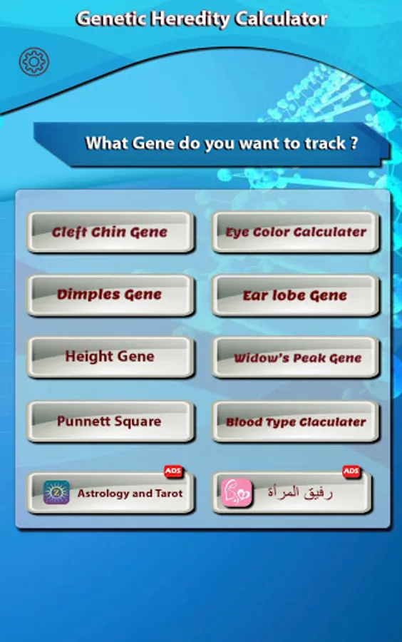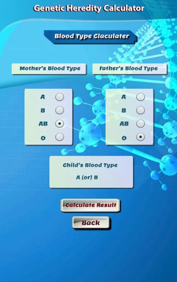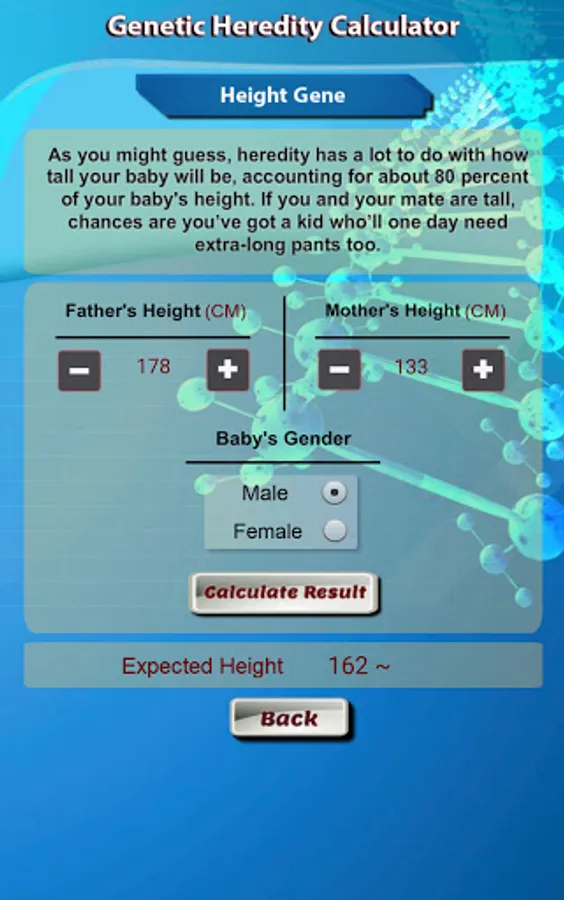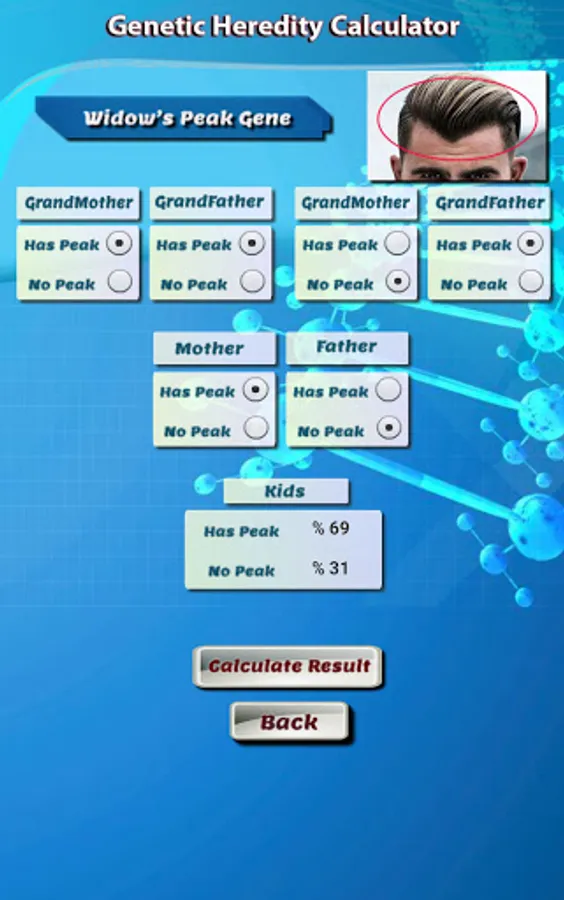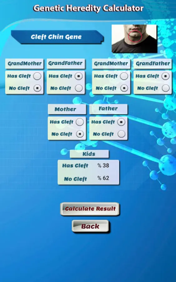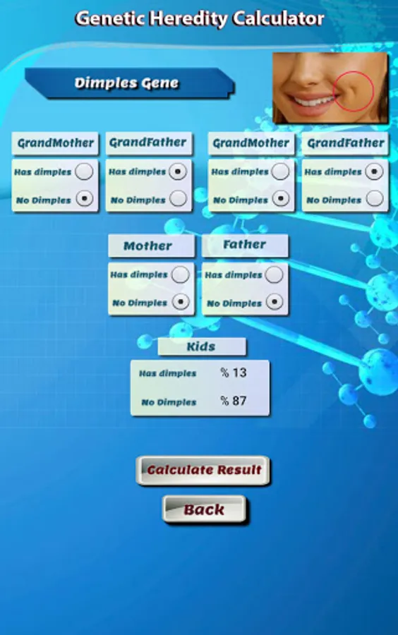 The Genetic Calculator is a unique application to predict some of the genetic traits of children by identifying the characteristic factors of parents and grandparents of the first degree. Accurate percentage of scientific and logical calculations under the supervision of experts and specialists in genetics.