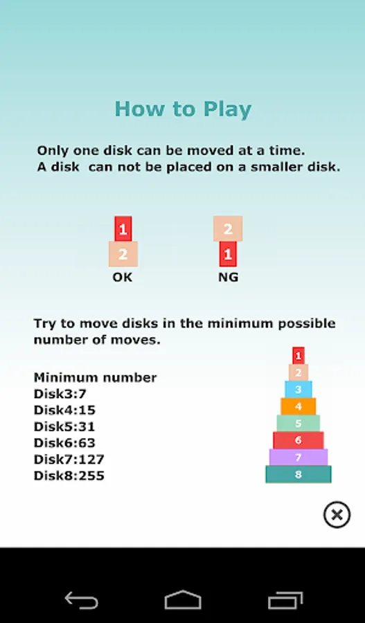 Only one disk can be moved at a time. A disk can not be placed on a smaller disk. Try to move disks in the minimum possible number of moves.