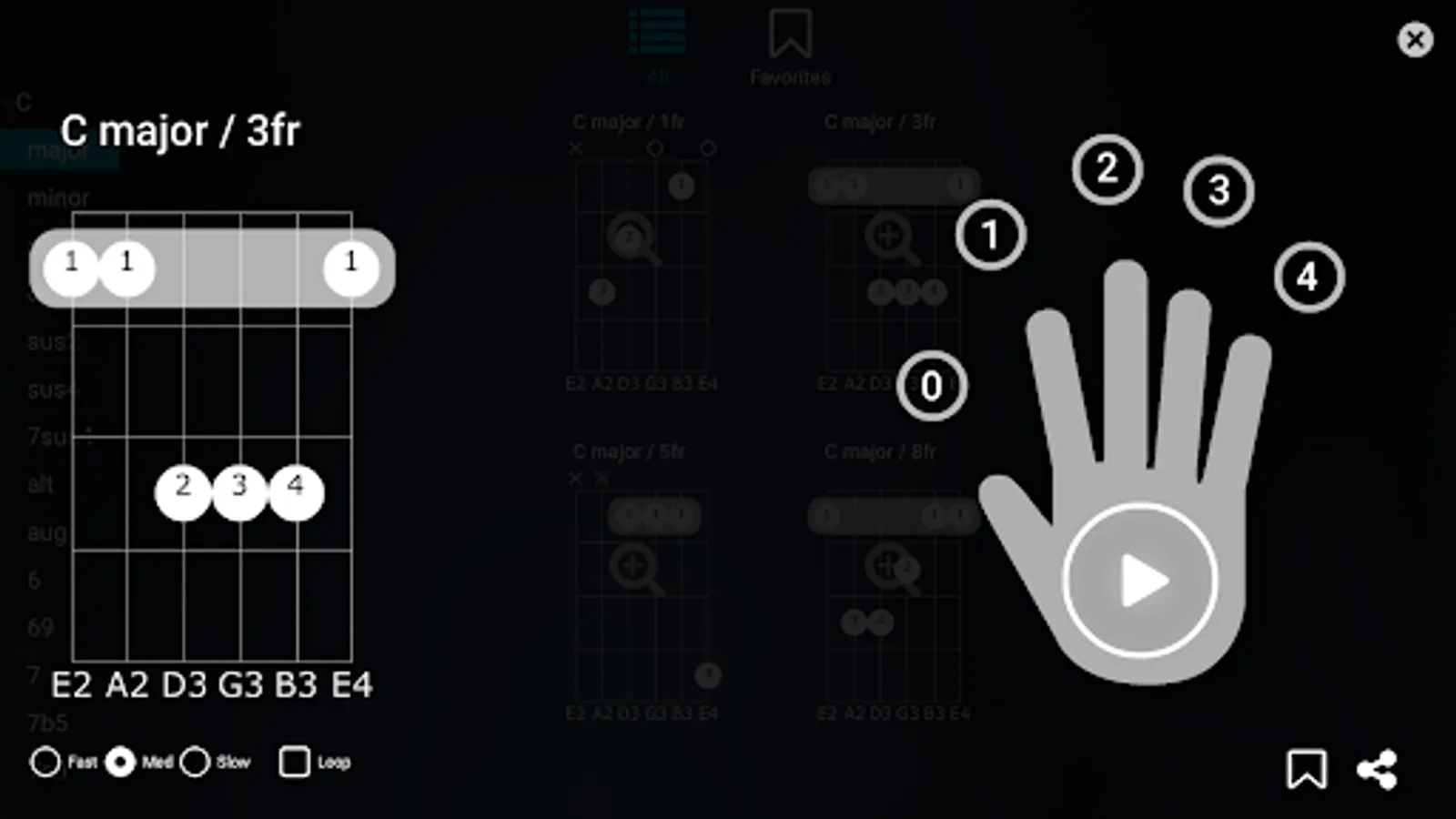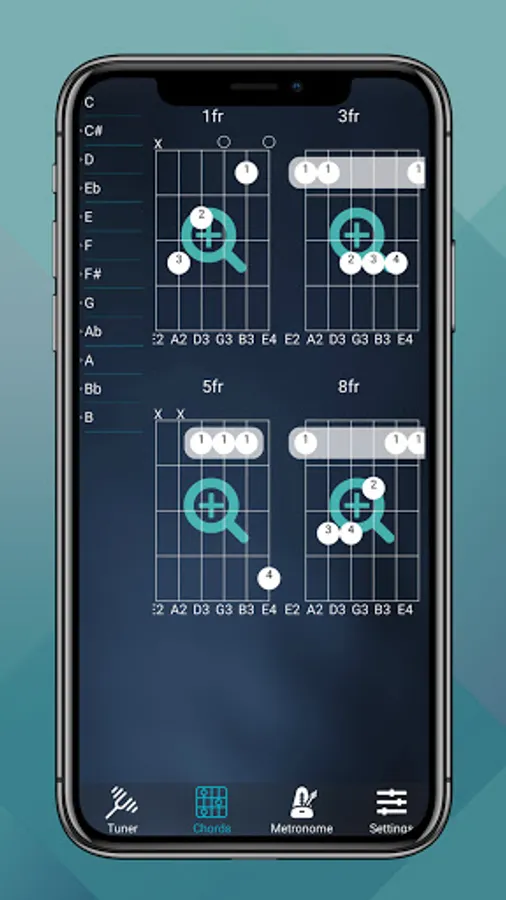 All guitar chords in one app! You can find any guitar chord fingerprint. Listen to guitar chords with different speed and looping.