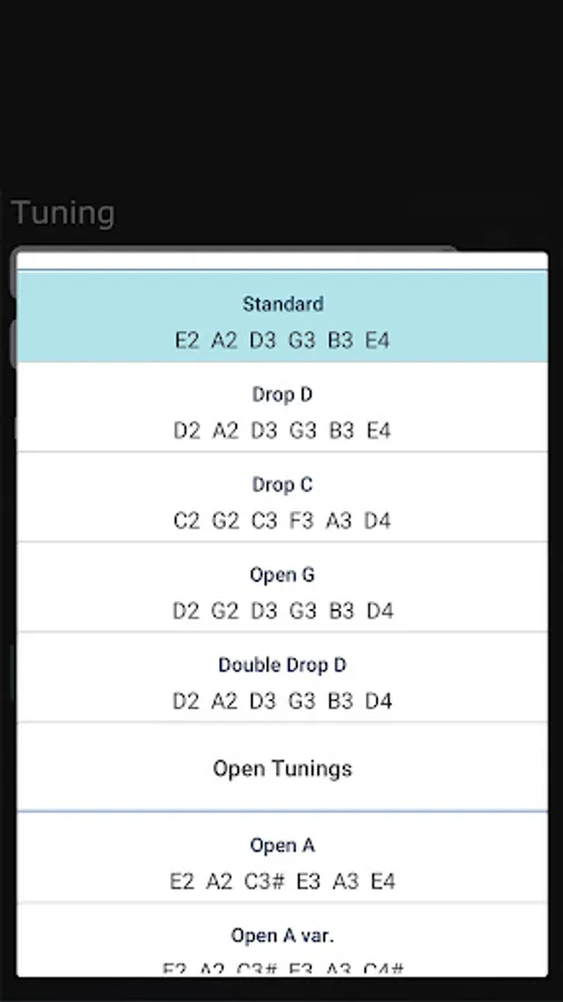 6-string guitar tuner: Standard tuning, half-step down, whole-step down, Drop D, Drop C, Open D, Open D, Open G, Open C, Open A, All fourths
