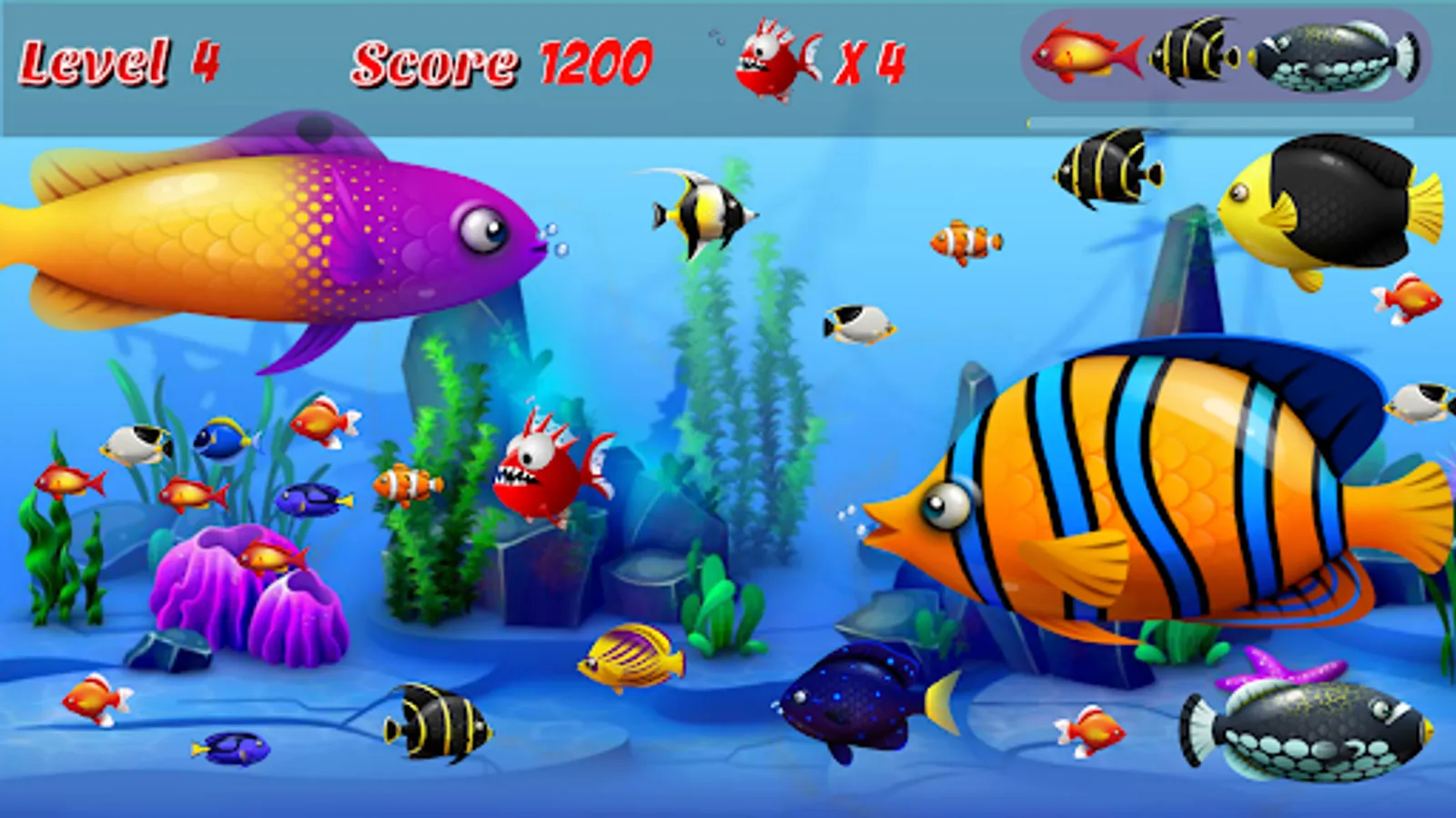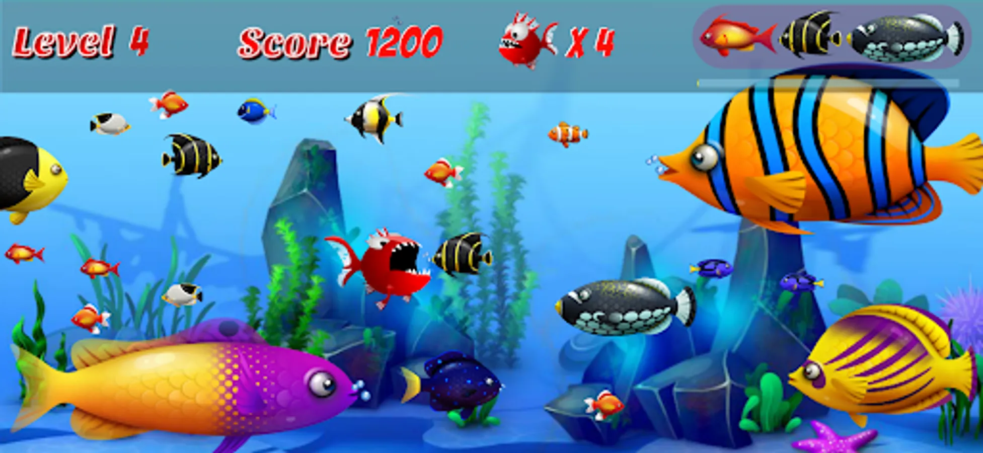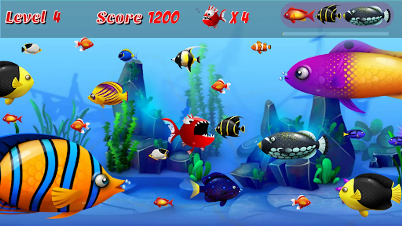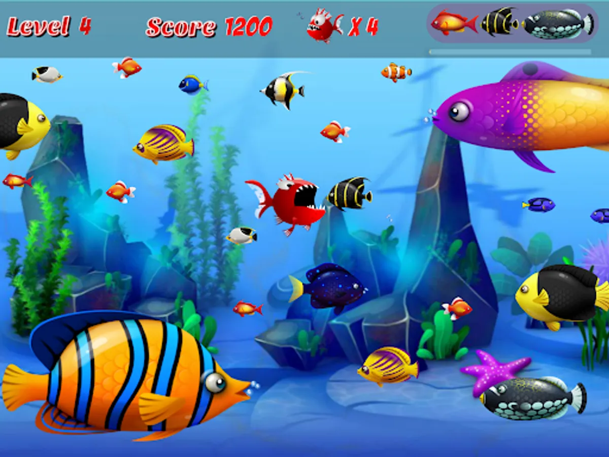 At the beginning of each chapter, you are a small fish. The hero Piranha fish starts fishing (eating small fish and grow up). The largest fish is Shark ( you cant eat a shark )
