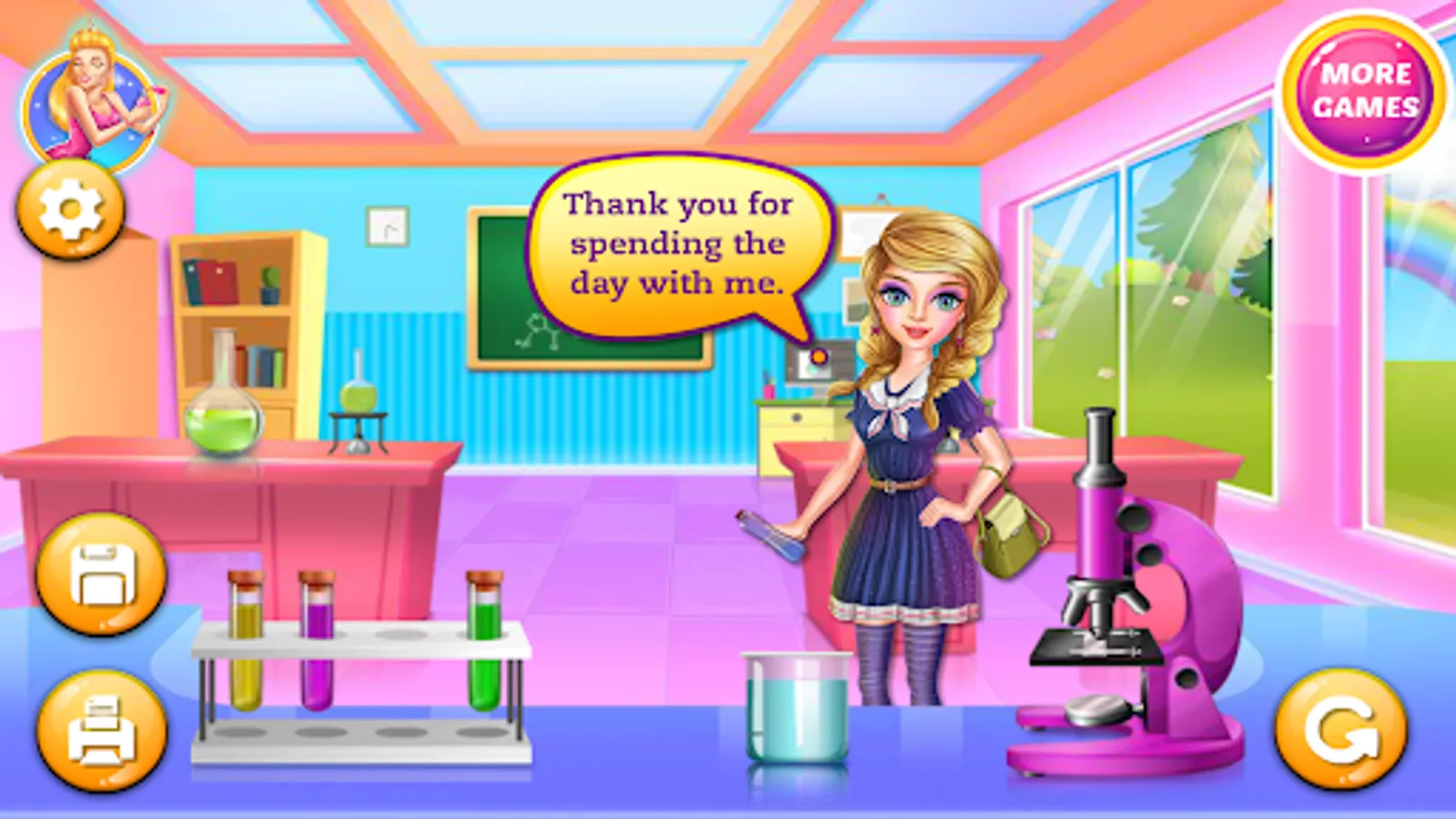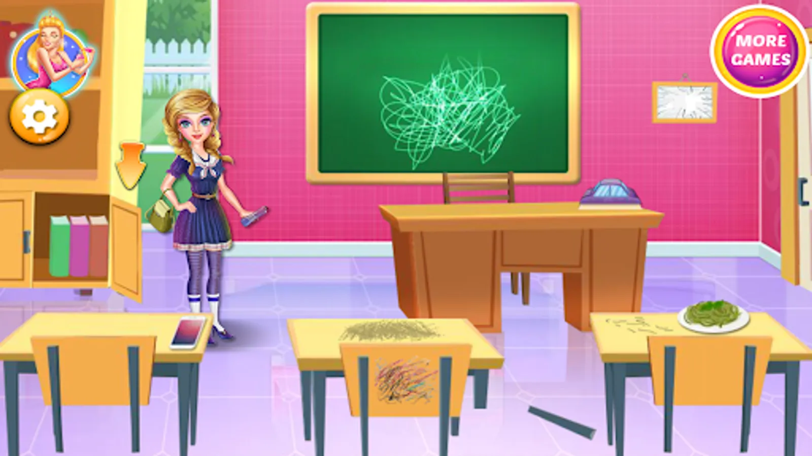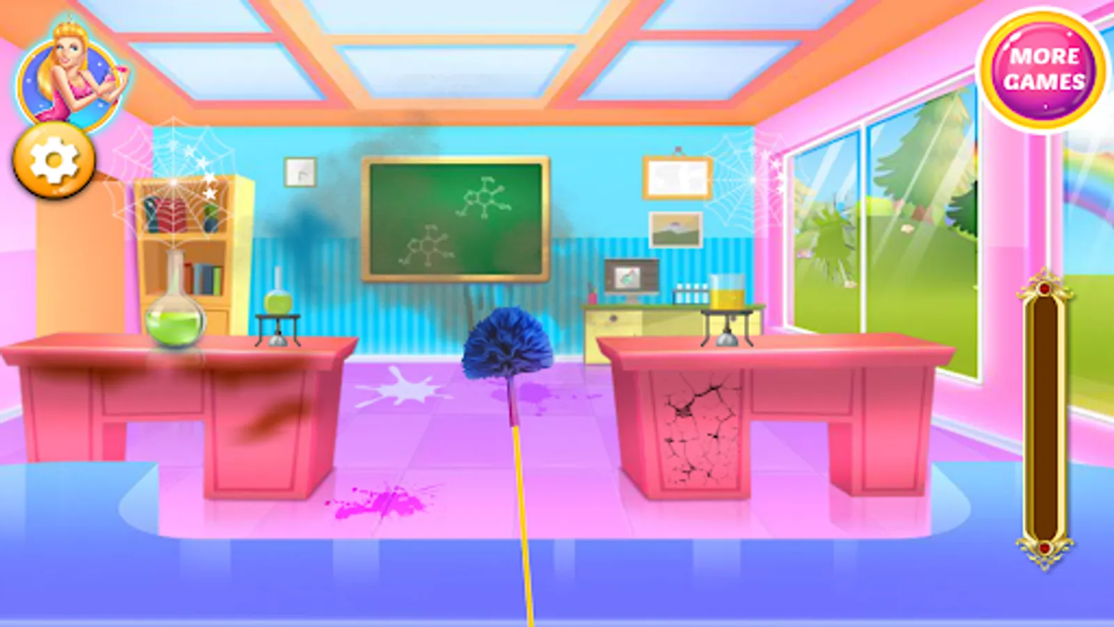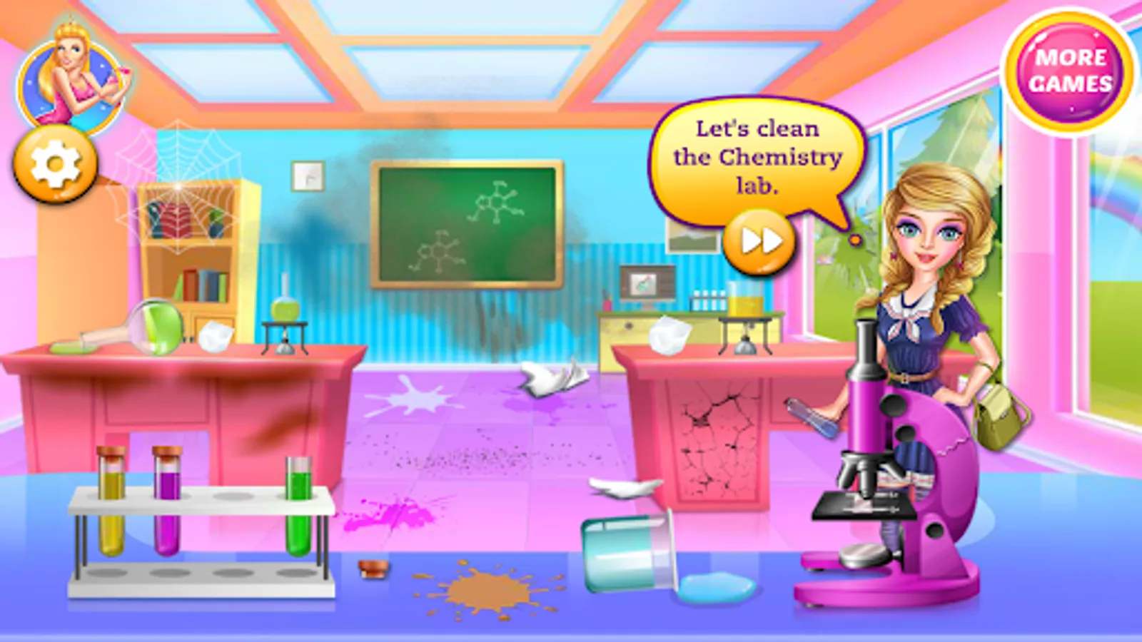 First, you need to clean the tables from stains, and then put the books in the closet. Use detergent to clean the wall, clean the spilled juice with a towel, then the floor, cabinet, and ballast. Go to the detective, this is a very important step in cleaning toys. First you need to get rid of broken and empty lab tubes, then clean the tools and the wall. Then go to the department again where you can clean out the closet and return the things. Make the most of your time with this long stage cleaning game.