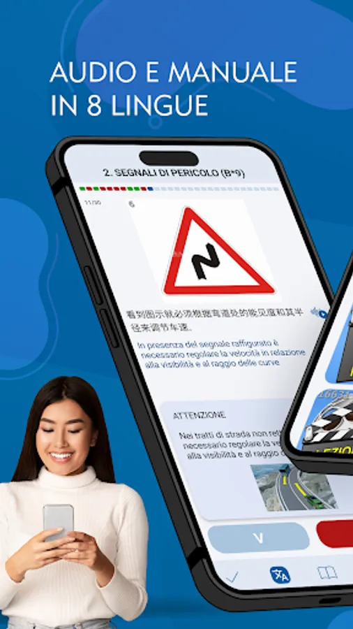 8 LANGUAGES: driving license quizzes in 8 different languages – Italian, French, English, German, Arabic, Chinese, Russian and Spanish with translation into Italian.