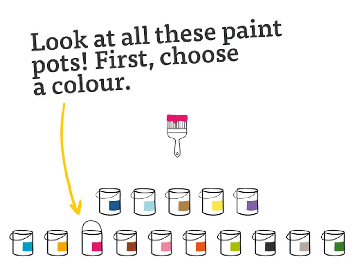 Look at all those paint pots! There are eighteen different colours to choose from, and one big paint brush – your finger. Pick a colour and, with big finger-brushstrokes, fill your white screen with colour until ... a cheeky animal emerges! There’s a lion roaring in the orange, a pig trotting in the pink, and – ribbit! – a frog hopping around in the green. Just tap the animals to interact with them, play with them, and see what they do next.