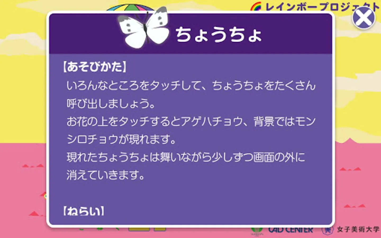 If you touch a flower [one of clustered flowers] a swallowtail will appear,while you touch the background a cabbage white will appear. Butterflies that appeared on the screen will fly away towards the outside of the screen.