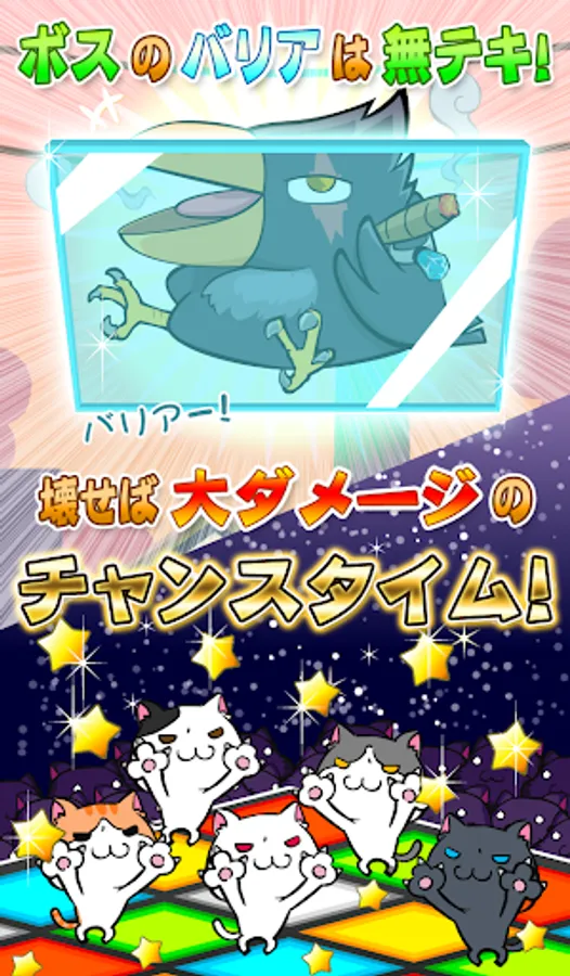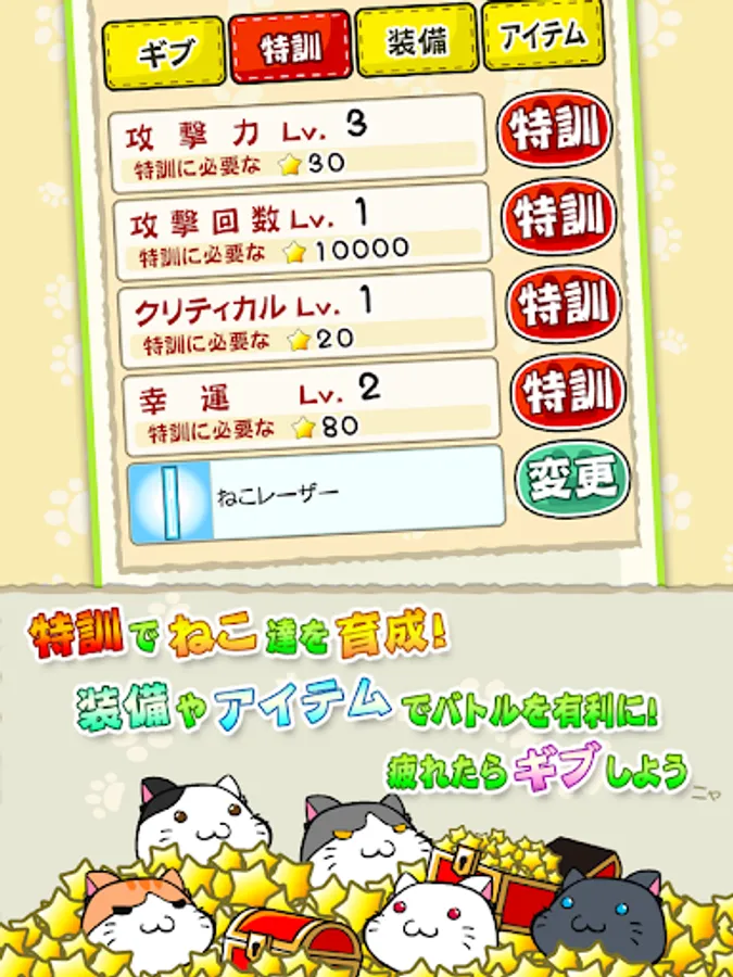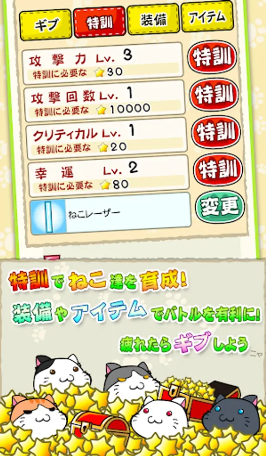 ねこの攻撃テキさんに当たると「★」が落ちてきます。その「★」を使い、特訓することで、ねこ達のレベルが上がり、どんどん強くすることができます。