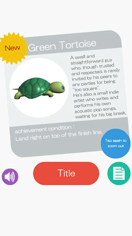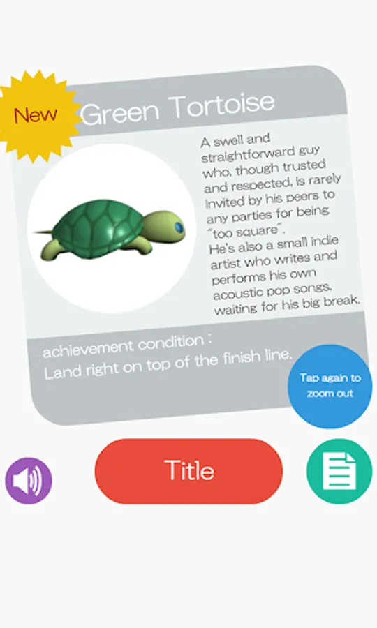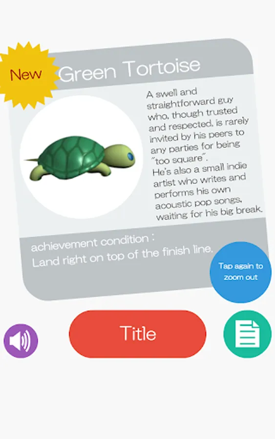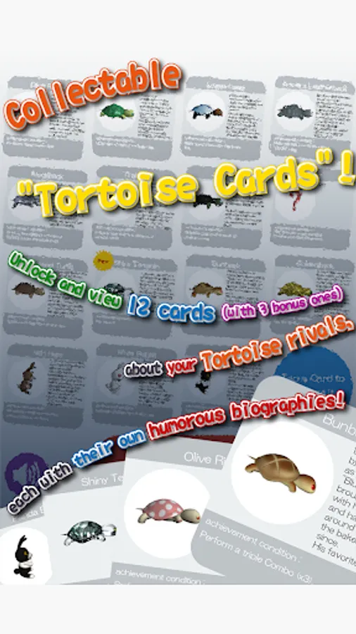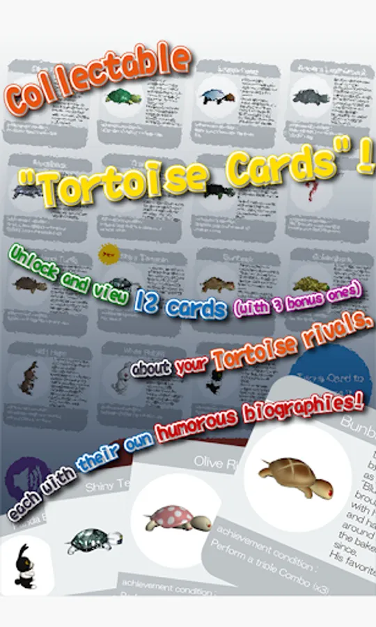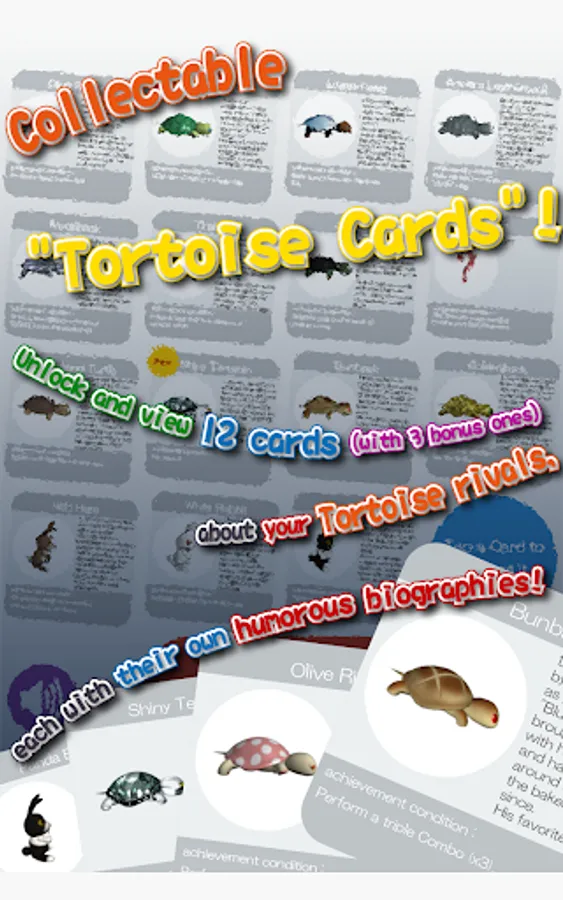 * Acomplish certain feats during a race to obtain viewable "Tortoise Cards", each featuring info about your rivals - some heartwarming, some humorous! Collect them all!