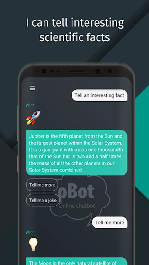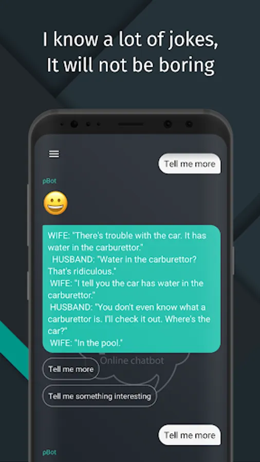 In addition to the dialogue, the bot can tell jokes, interesting facts, and even tips on how to meet women. There is a special menu on the bottom left corner.