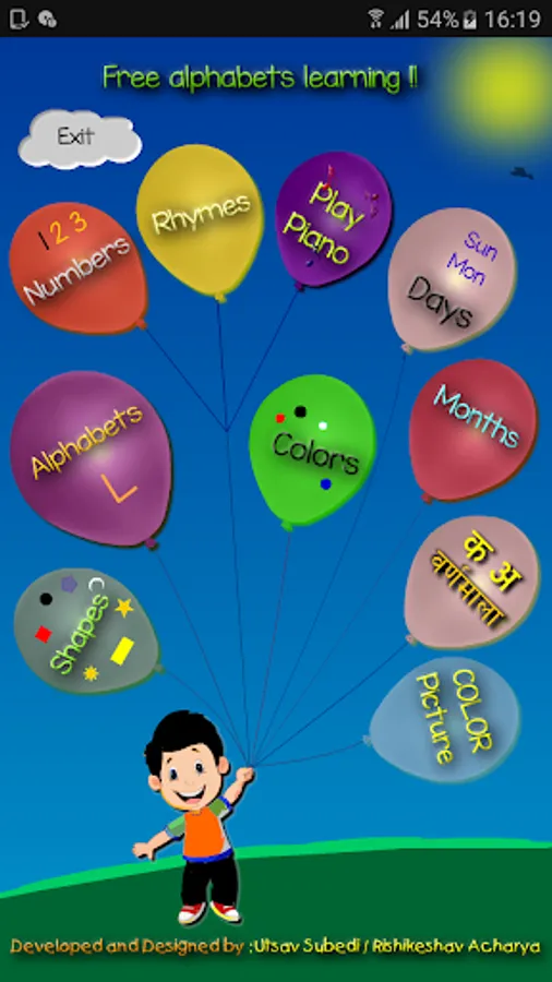 This app contains free alphabet in English, Nepali and Hindi, number, shape and color teaching tools that makes learning fun for children, from toddlers all the way to preschools and kindergarten. With just a matter of finger tap arrows the toddler, preschoolers and kindergartenerscan learn English, Nepali, and Hindi alphabets in a minute. The fun and interesting part of the app is that it has a inbuild piano. The app also teaches about the numbers, days of the week, months of the year and has a picture that the children and choose their colors. The rhymes included in the app are various famous with lyrics and some tunes. The app is waiting for a game for first update.