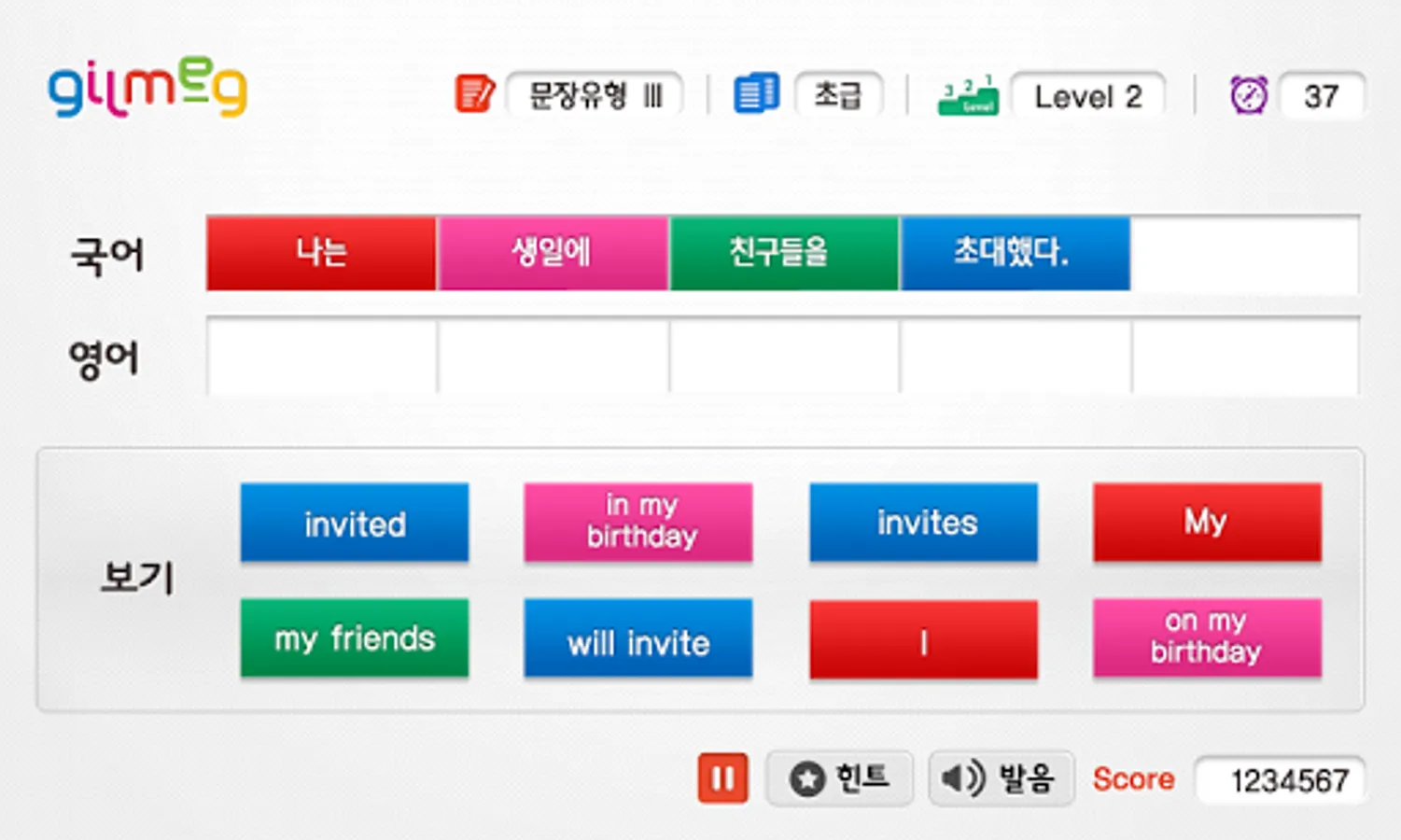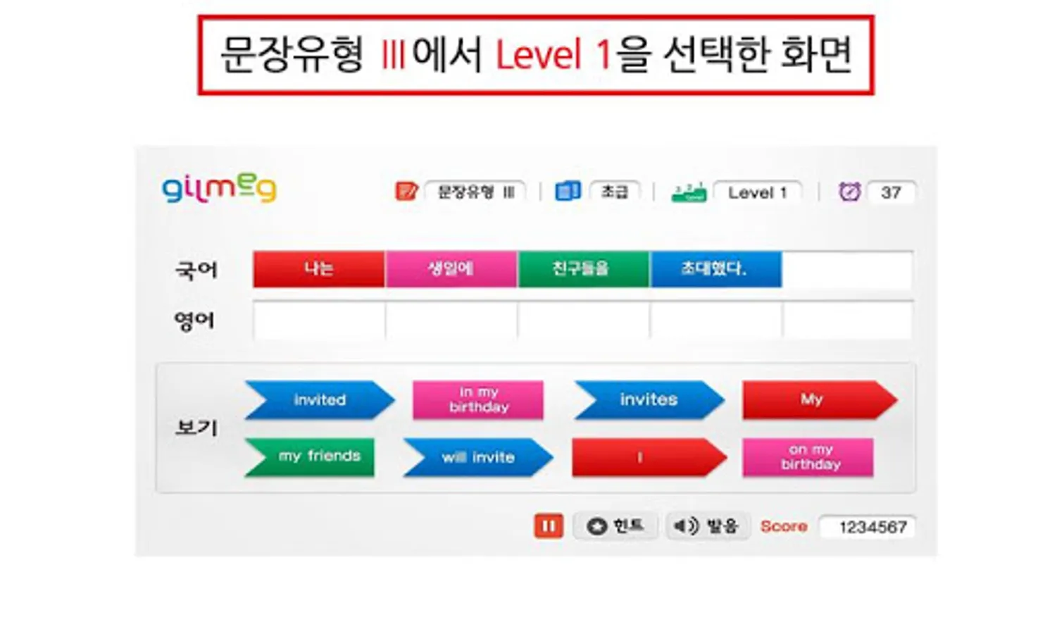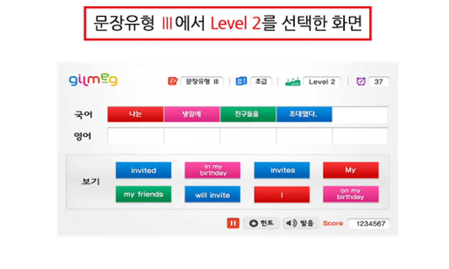 6) 게임레벨이 영어 선택은 3단계, 국어 선택은 2단계로 구성되어 있어서 동일한 문장을 가지고 유저가 난이도별로 반복적으로 학습할 수 있어서 교육적 효과가 높다.