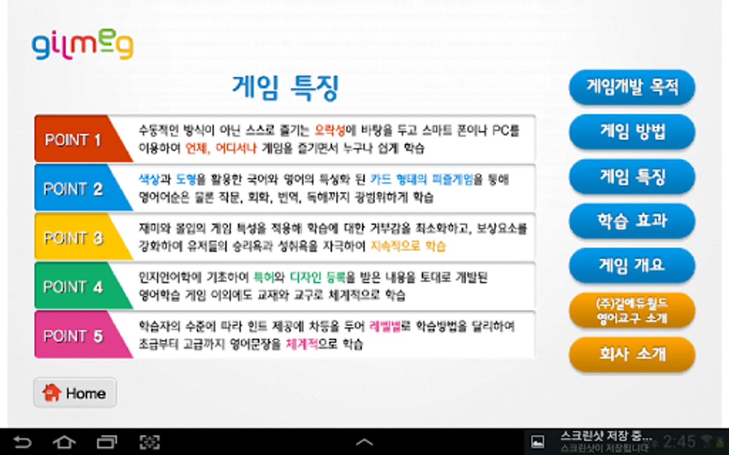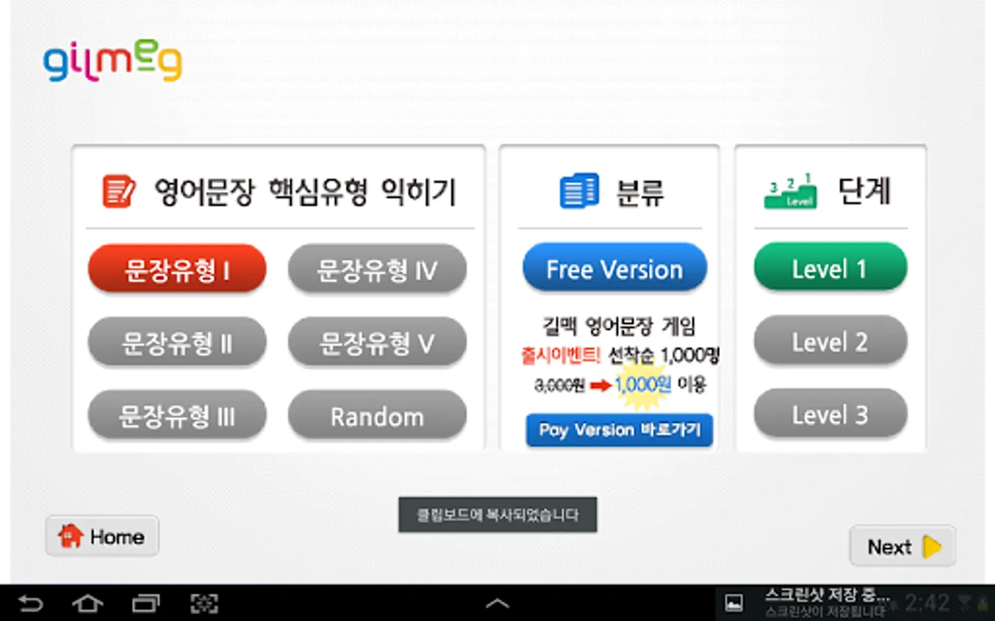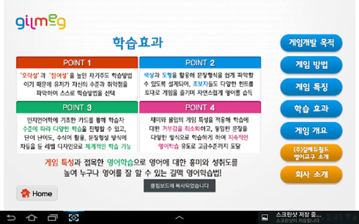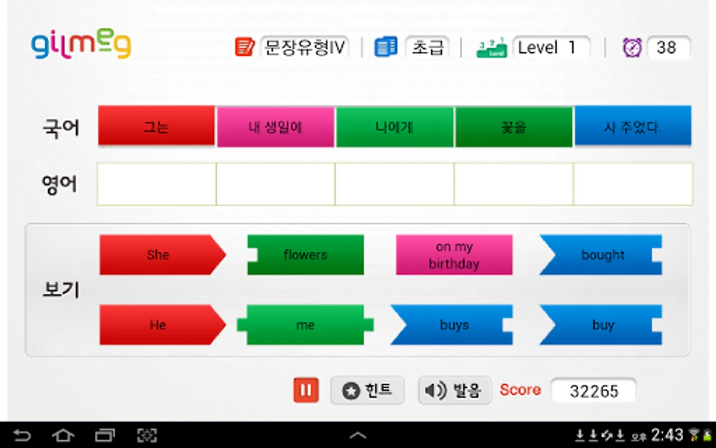 6) 게임레벨이 영어 선택은 3단계, 국어 선택은 2단계로 구성되어 있어서 동일한 문장을 가지고 유저가 난이도별로 반복적으로 학습할 수 있어서 교육적 효과가 높다.