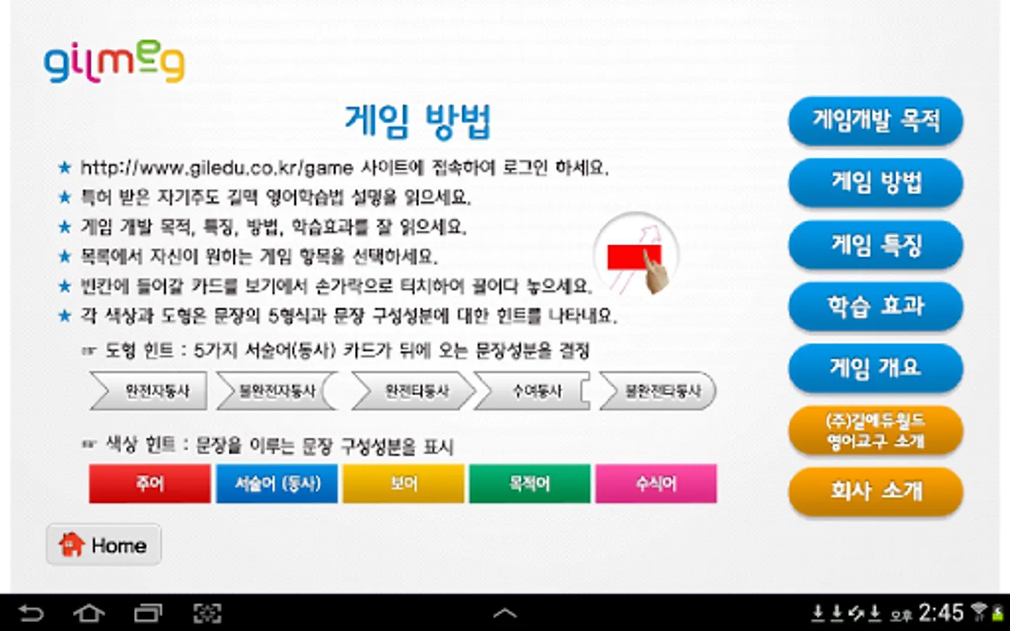 1) 색상과 도형을 활용하여 문장 구성성분을 5가지로 구분하고, 국어 2단계, 영어 3단계로 레벨별로 난이도가 조정된 특성화 된 카드 형태의 퍼즐맞추기 게임을 통해 국어문장을 보고, 영어문장을 익히는 학습게임이다.