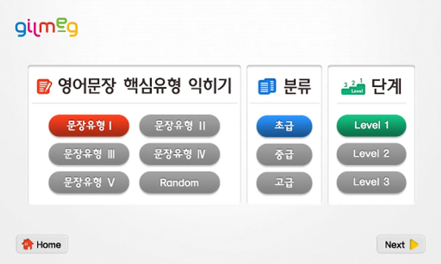 2) 유저가 먼저 문장유형 6가지 중에서 하나를 선택한 후 초급, 중급, 고급 중에서 자기수준에 맞는 항목 하나를 직접 선택한다. 그 다음 힌트 제공에 차등을 둔 Level 1~3 중에서 어느 하나를 선택하여 게임을 하는 방식이다.