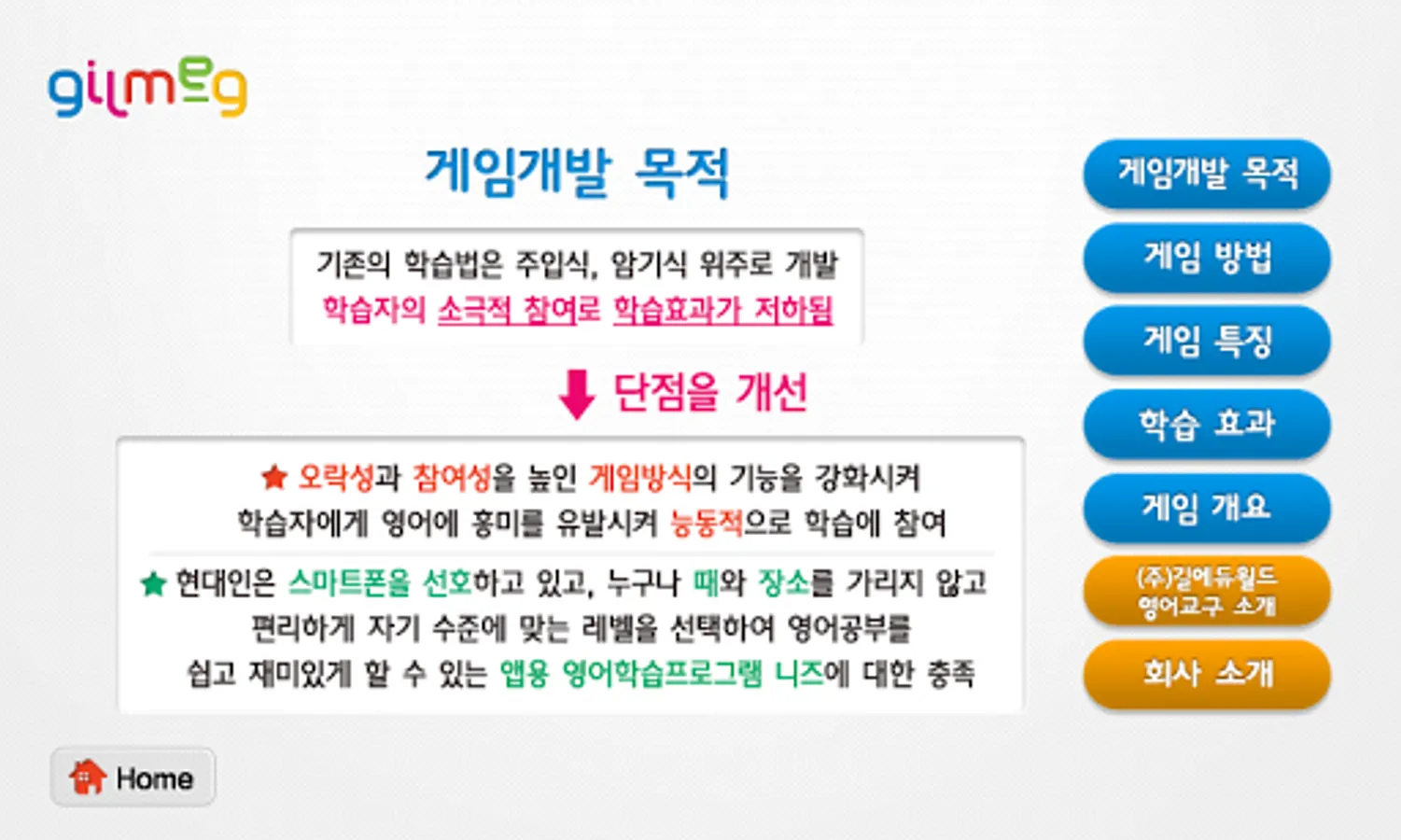 1) ‘오락성’과 ‘참여성’을 높인 “게임” 방식의 기능을 강화시켜 학습자에게 영어에 흥미와 관심을 유발시켜 능동적으로 학습에 참여시킬 수 있는 영어학습프로그램이 필요.