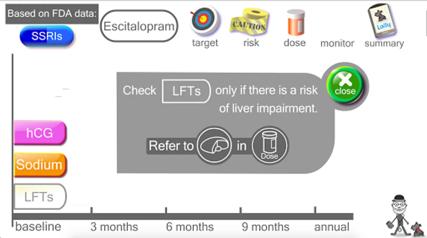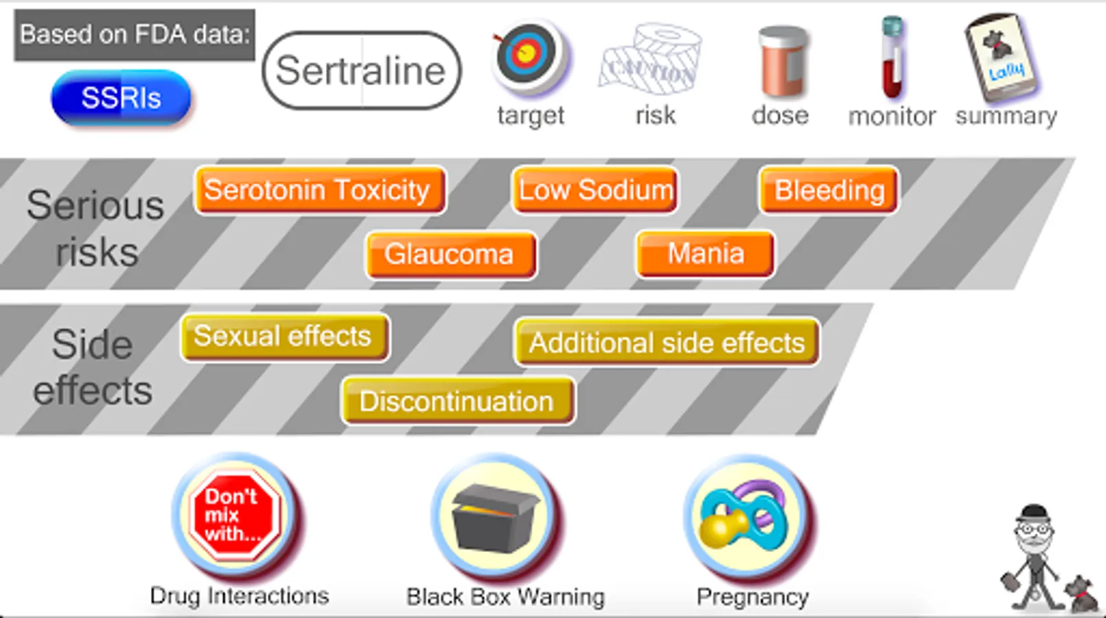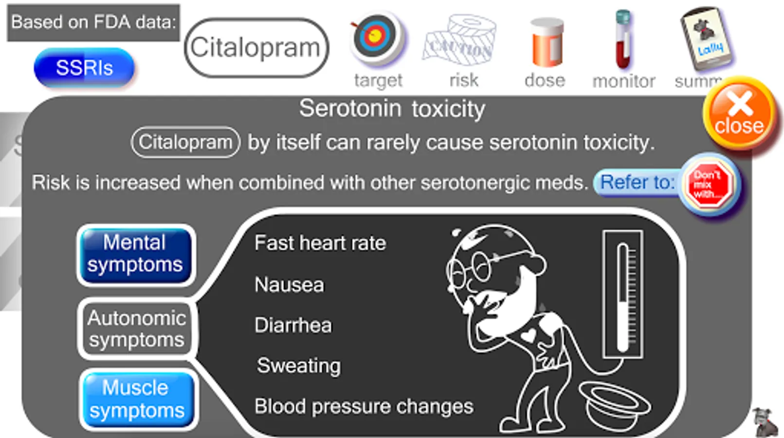 I am board-certified psychiatrist. I have taken the FDA guidelines on SSRI use and created this easy-to-use, animated, touch-screen reference. I don't think there is any other clinical reference that is quicker or easier to use. I hope you find the mix of DATA and DESIGN to be helpful in your practice or studies.