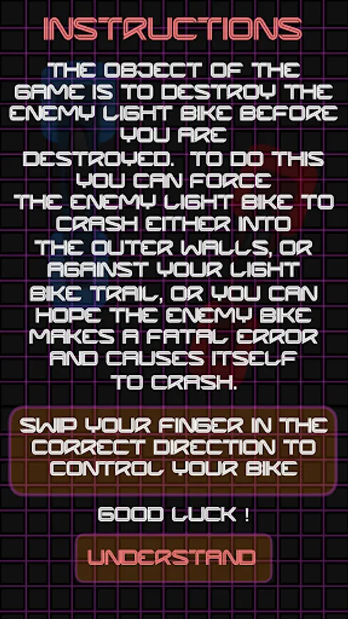 The object of the game is to destroy the enemy light bike before you are destroyed. To do this you can force the enemy light bike to crash either into the outer walls, or against your light bike trail, or you can hope the enemy bike makes a fatal error and causes itself