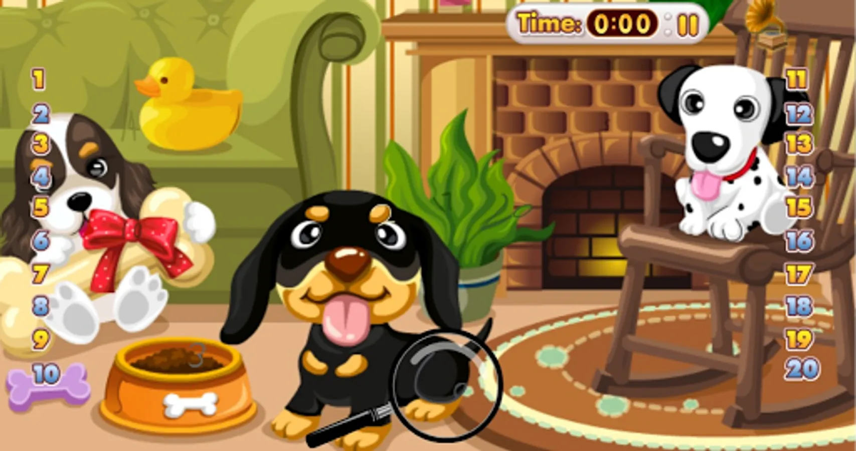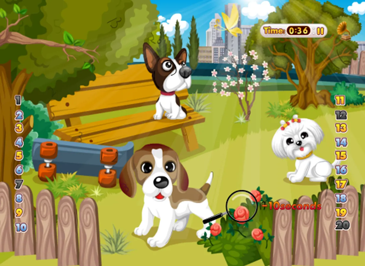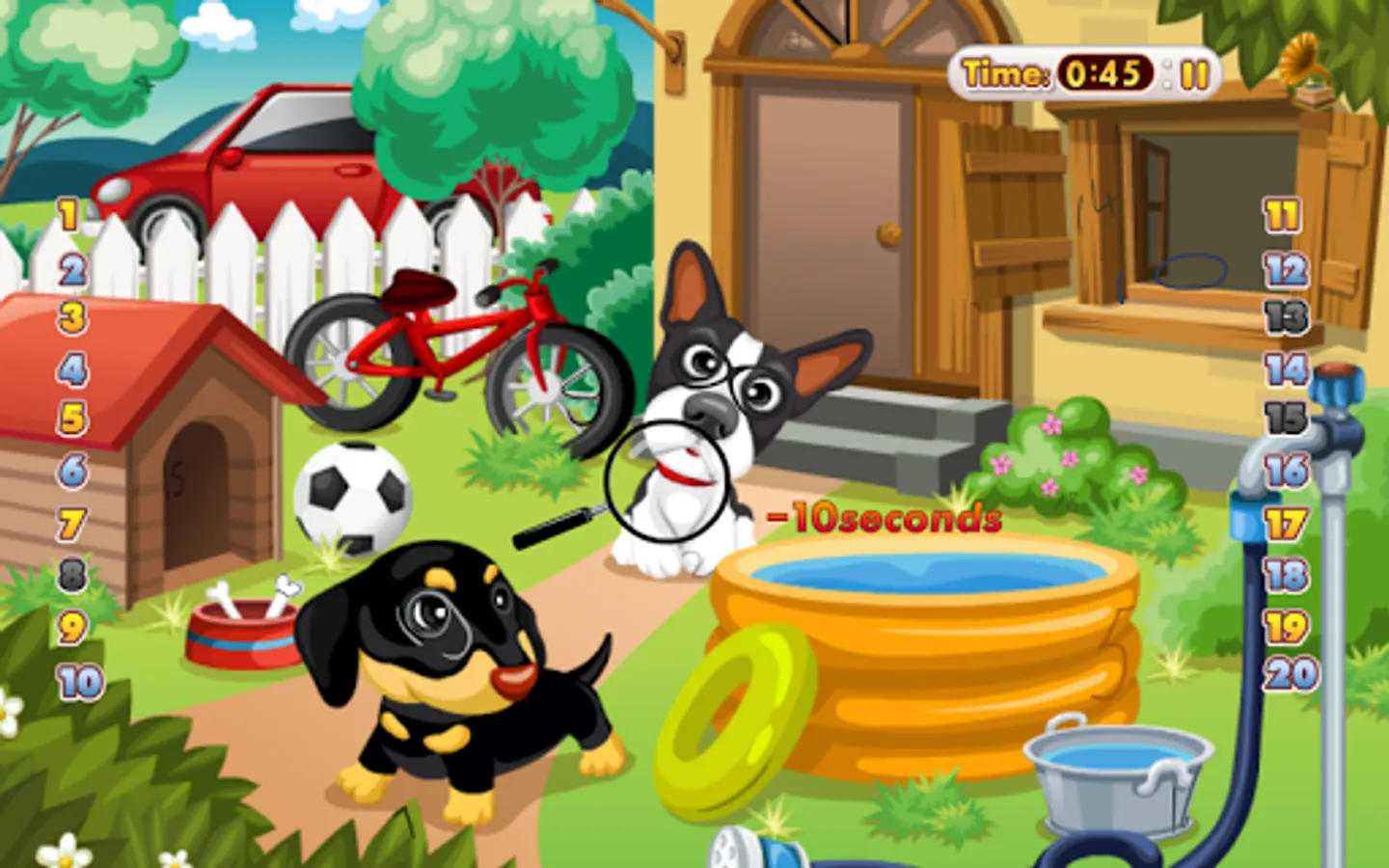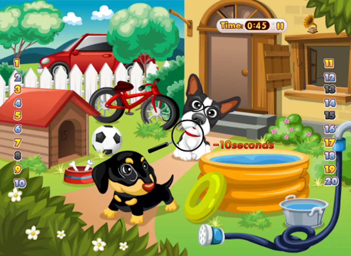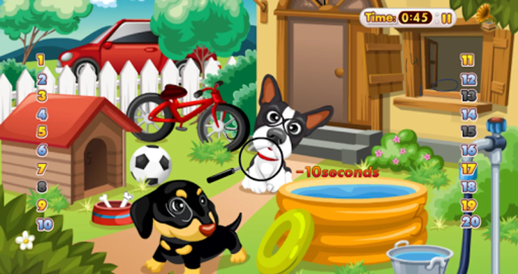 This is a funny game with dogs. On the images in this dog game you can see a cosy garden with a dog kennel, a little swimming pool, a bowl full of dog biscuits and a bowl filled with fresh water. The dogs are running around happily in the garden. Have a look at the images and enjoy. Of course there's much more to do in this game: each image hides 20 numbers. Find them all and keep an eye on the clock, as your time is limited!