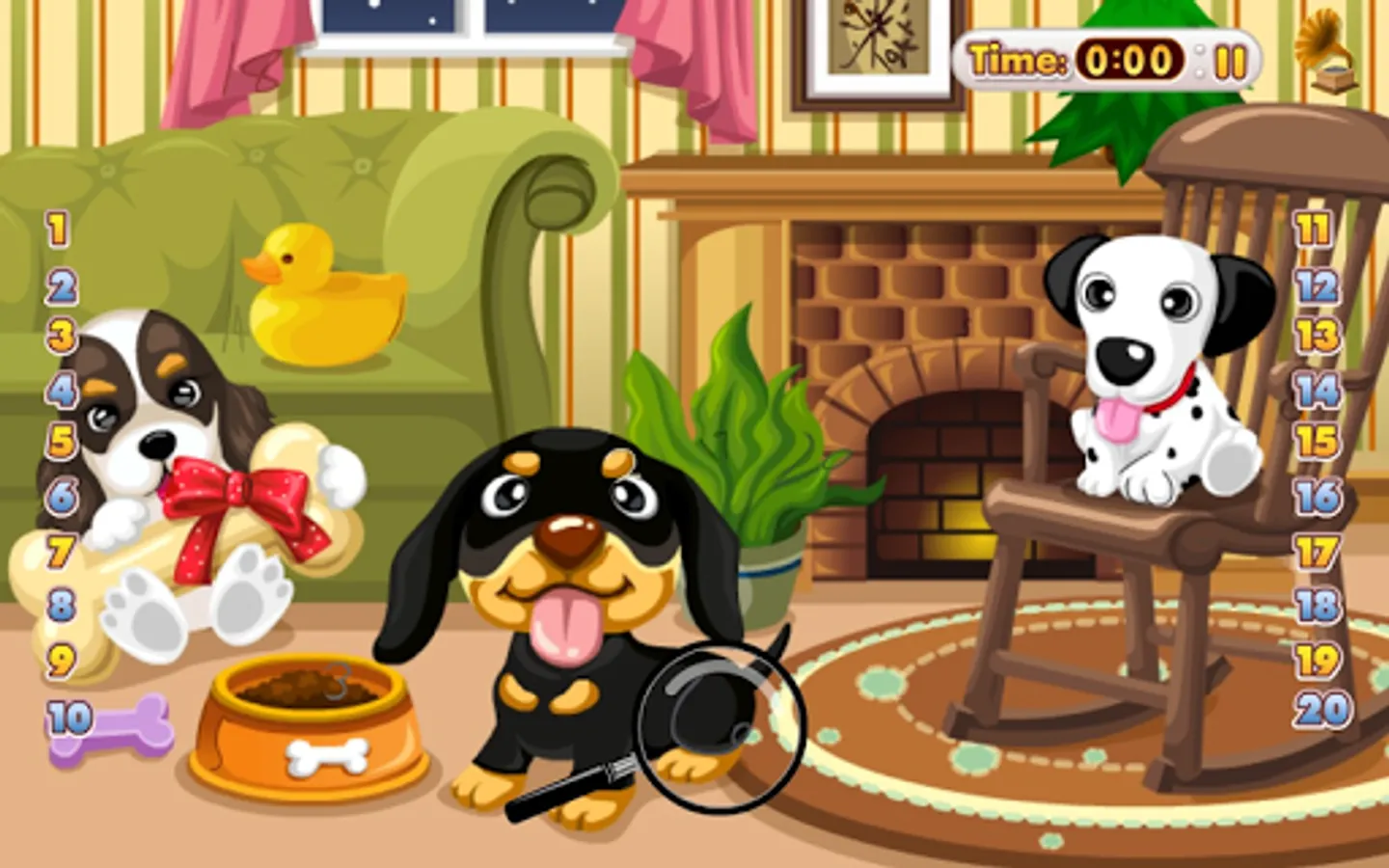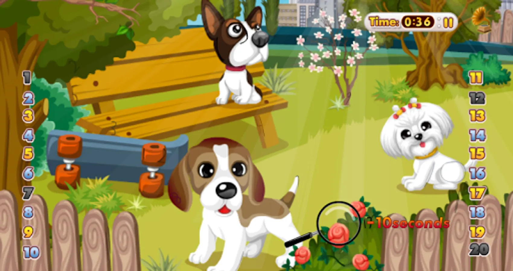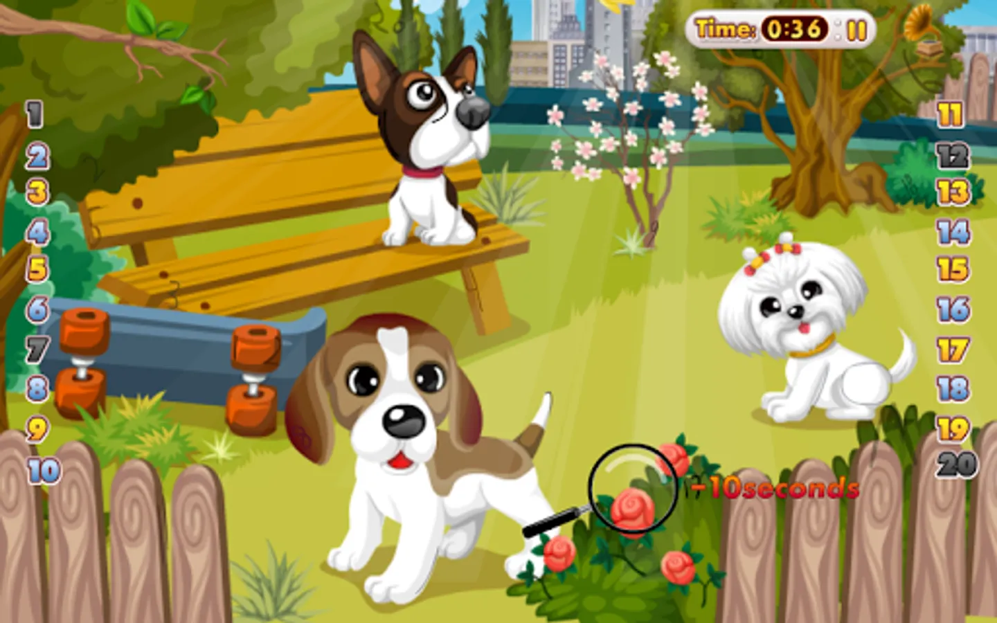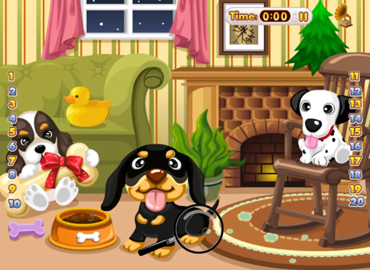 This is a funny game with dogs. On the images in this dog game you can see a cosy garden with a dog kennel, a little swimming pool, a bowl full of dog biscuits and a bowl filled with fresh water. The dogs are running around happily in the garden. Have a look at the images and enjoy. Of course there's much more to do in this game: each image hides 20 numbers. Find them all and keep an eye on the clock, as your time is limited!