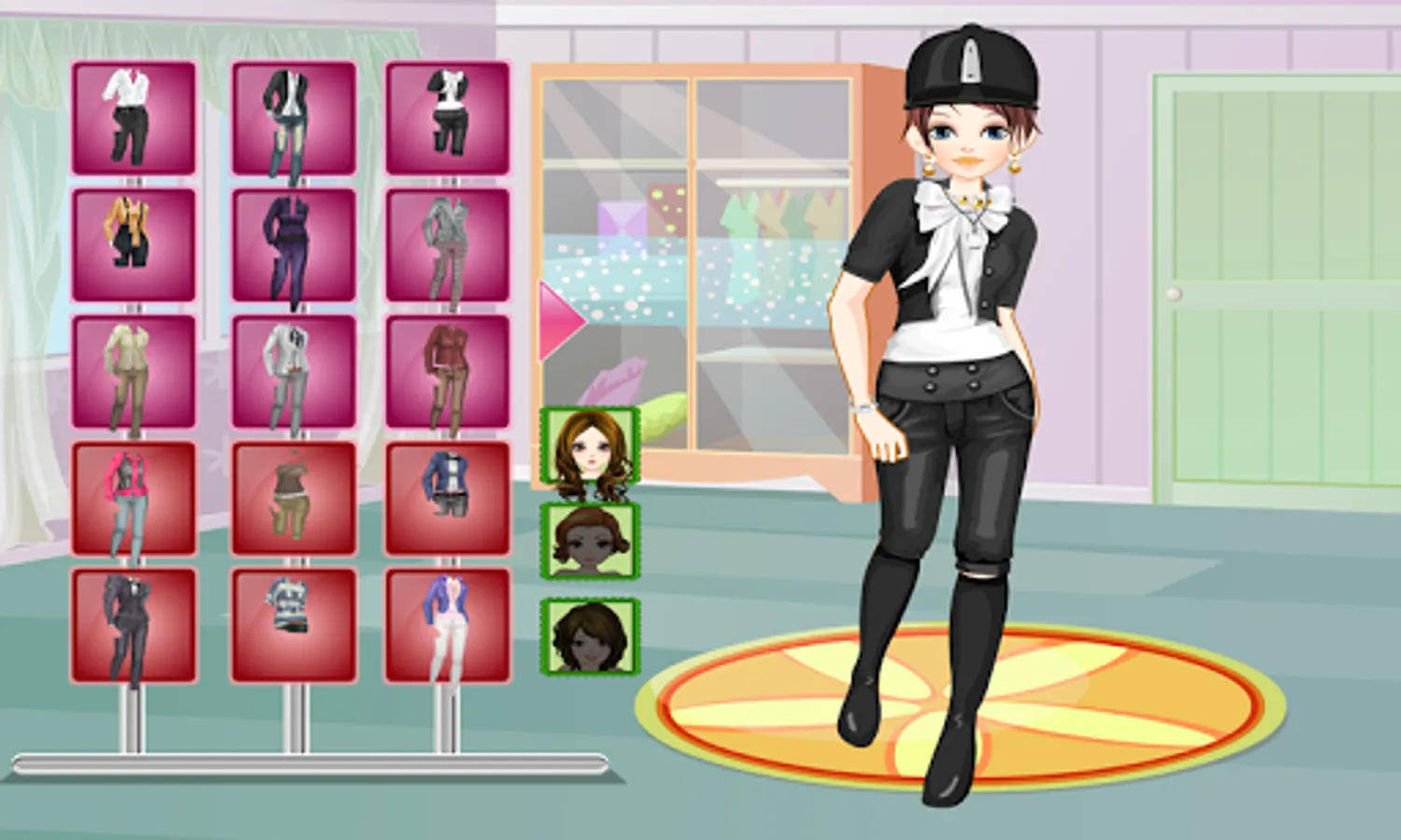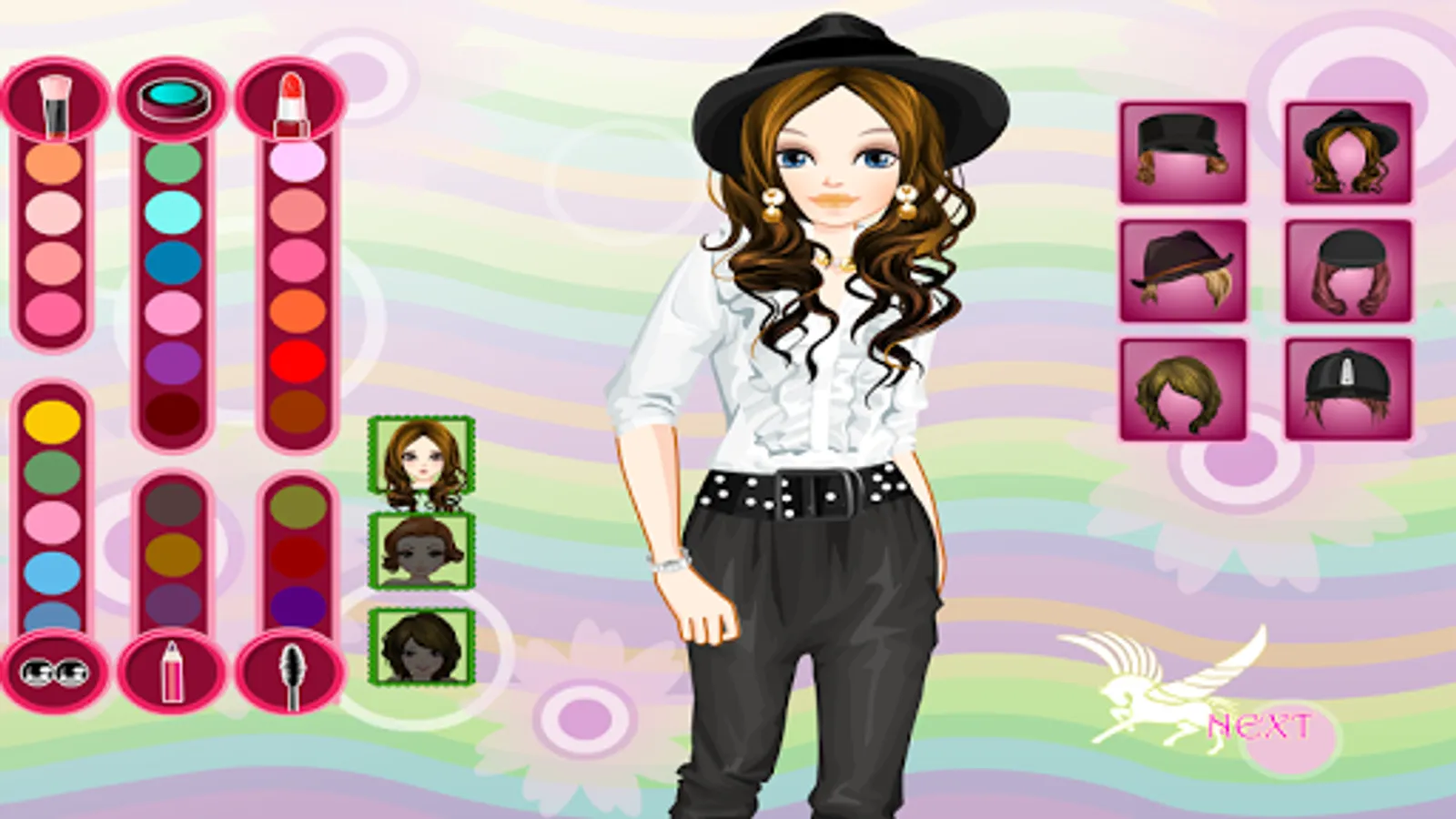 Play this horse game starring three girls. Carmen, Cathy and Cindty love horses. Today they will take their favorit horse for a ride. But first they need to find the rights riding clothes. You can choose from many beatuiful outfits in this game. The girls appear one at a time, so you can find them the right hair style and make-up. After that you will choose their clothes and you can see the results on the last page. Continue with the next girl or change more to this one