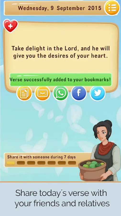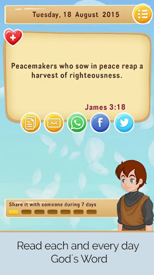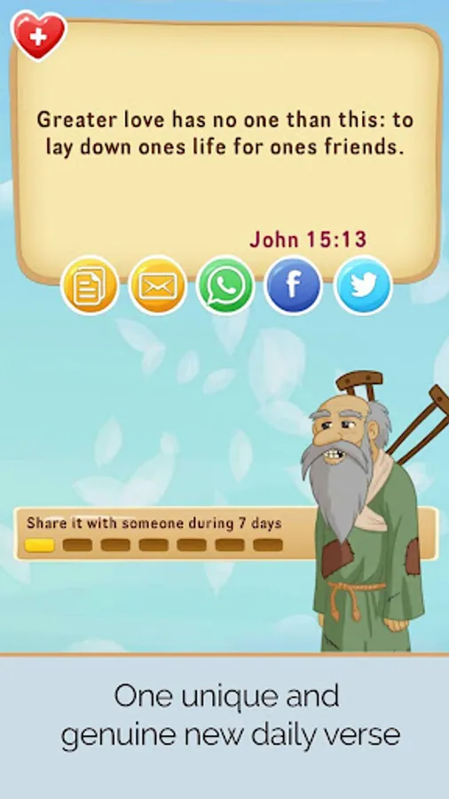 This is not a common Bible App. We wanted to create a simple app where you can read a unique verse from the Bible and share it with your friends and relatives on your Social Networks, via SMS and Email.