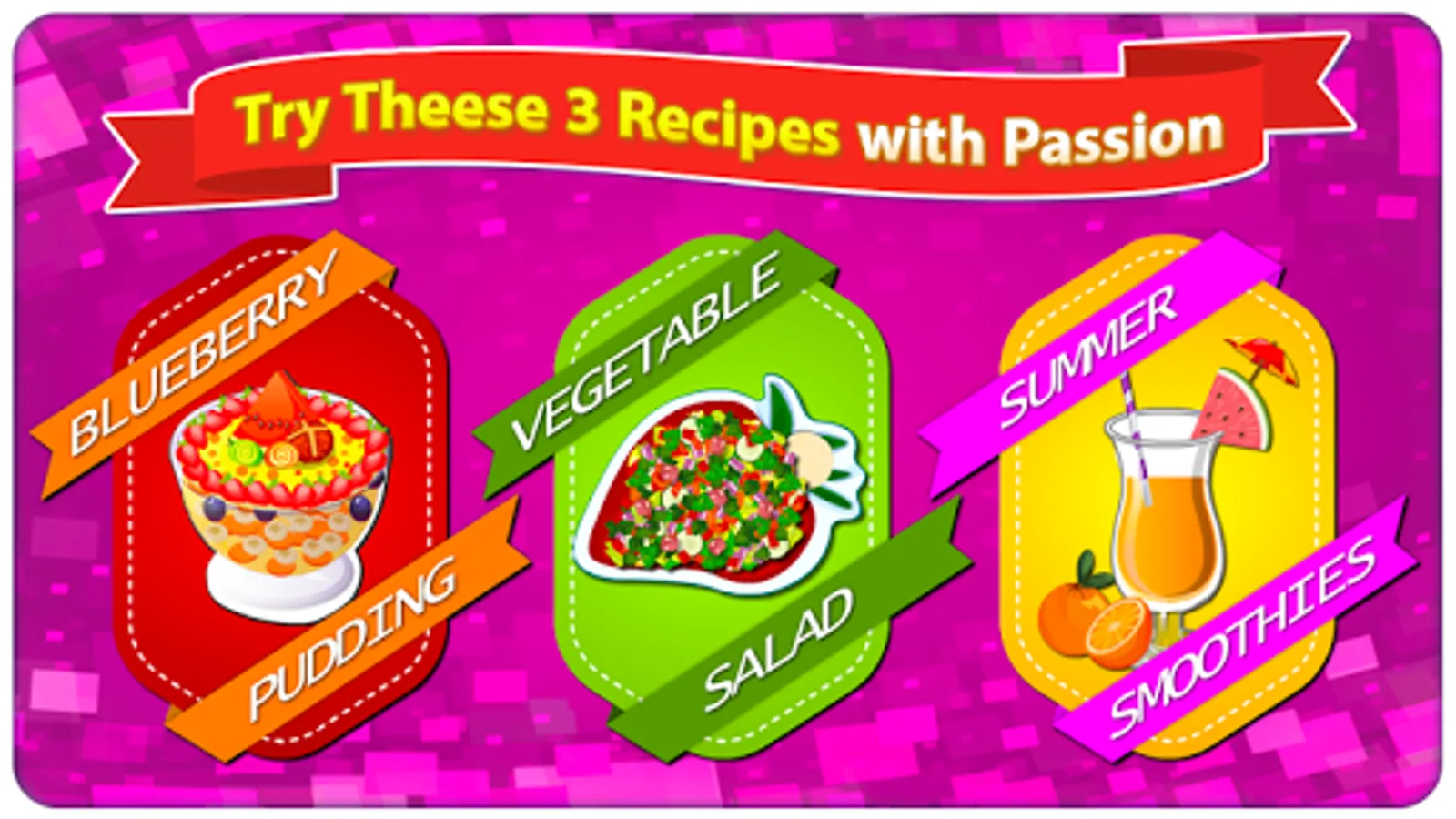 Cooking Passion is an amazing game for cooking fans, because it contains three delicious recipes: Summer Smoothies, containing lots of fresh summer fruits, a healthy and light Vegetable Salad to keep you in shape, and a Blueberry Pudding, which is the an extremely addictive delicious desert.