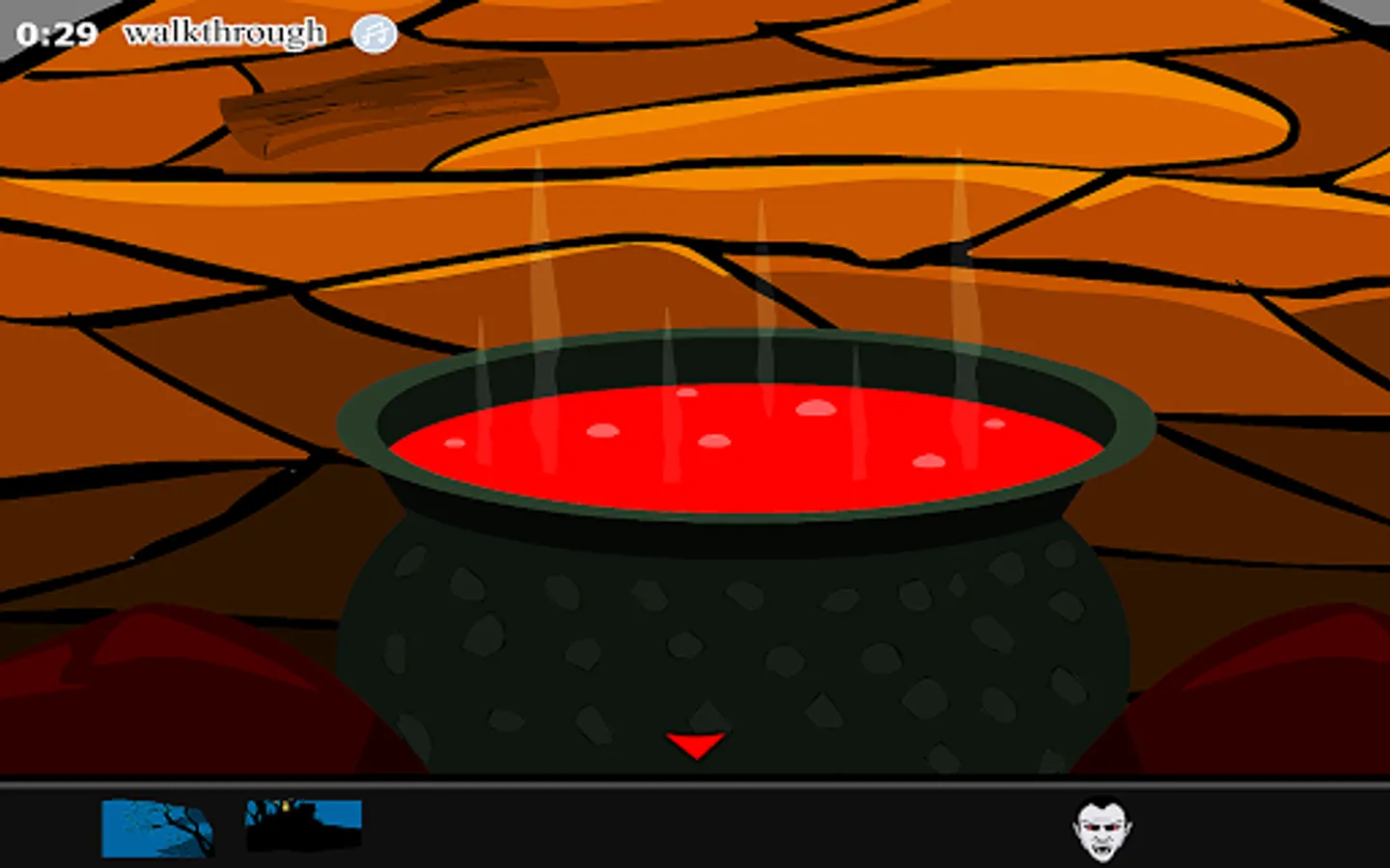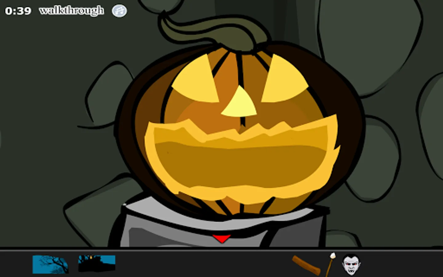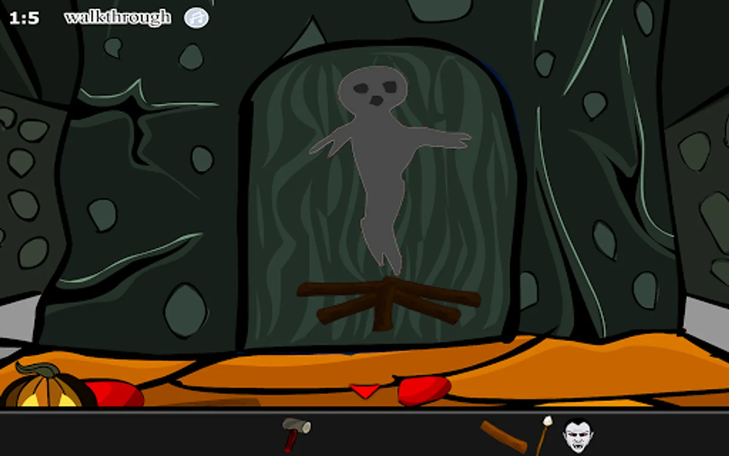 Place all the masks on the door and get a leg, pumpkin and skull. Place all the three in the burning vessel. Get a key from that. Use the key on the keyhole on the right for a candle. Get a firing stick from the pumpkin on the right and light it in the candle. Use the lighted stick in the bats and get two rats. Give the rat to the spider and the cat and get two logs.