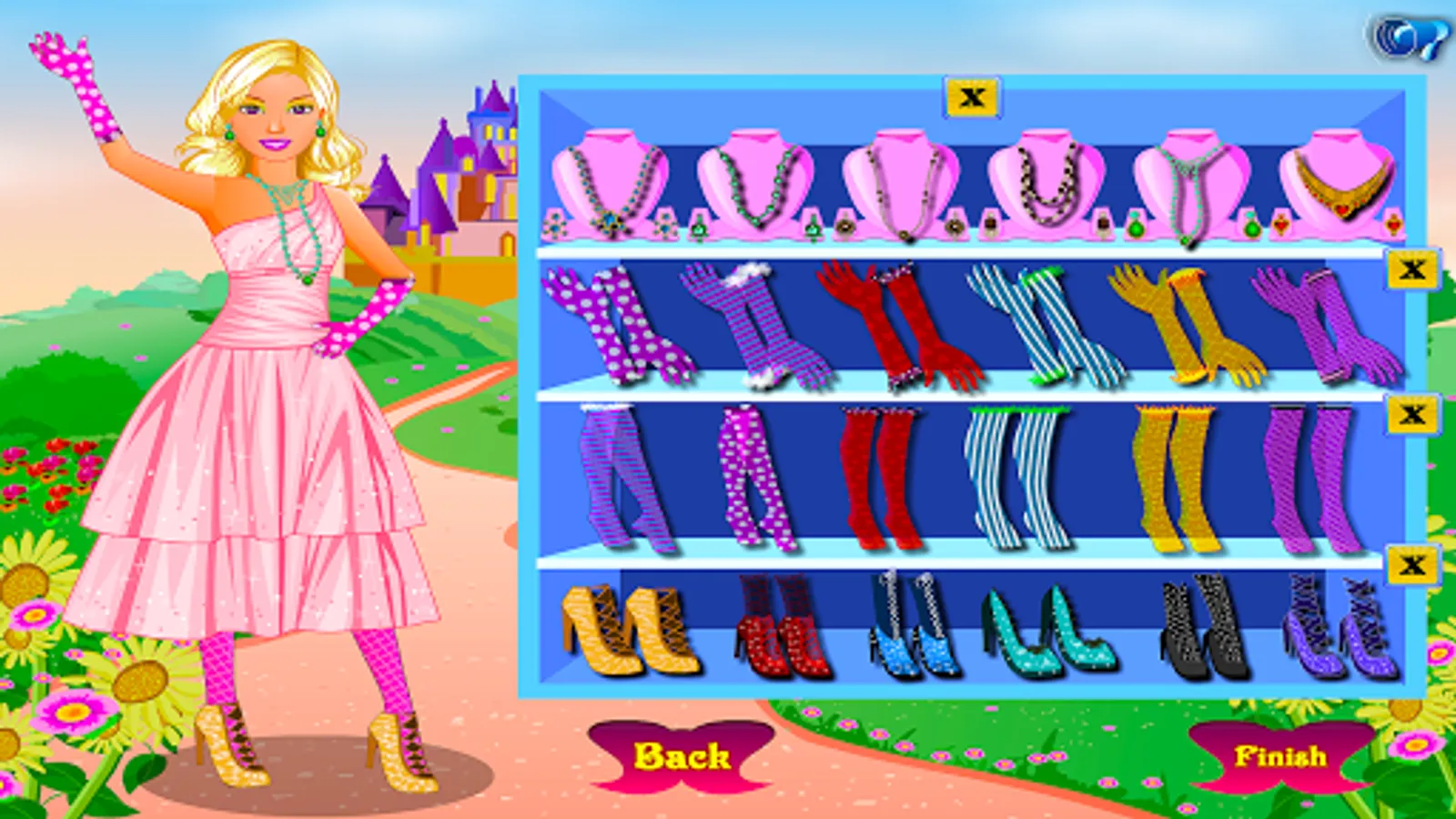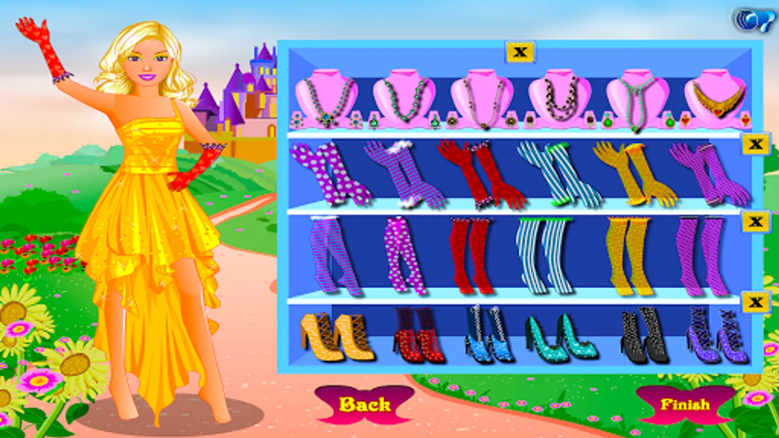 After you finish with the make-up step, move to our princess wardrobe and choose the one you think fits better to her…of course it will be a big, glamorous princess dress. There is no outfit without accessories and the perfect pair of shoes so find all these in the next step. Wish you good luck playing our dress up princess game.